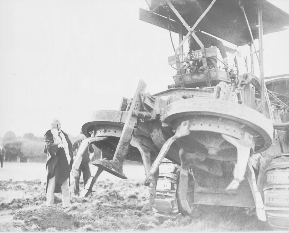 Lloyd George transforms 160 idle acres into market garden. Night and day work. Mr. Lloyd George watching the gyro tiller at work on his new farm at Churt. The immense claws revolve as the machine travels and churns up the land.