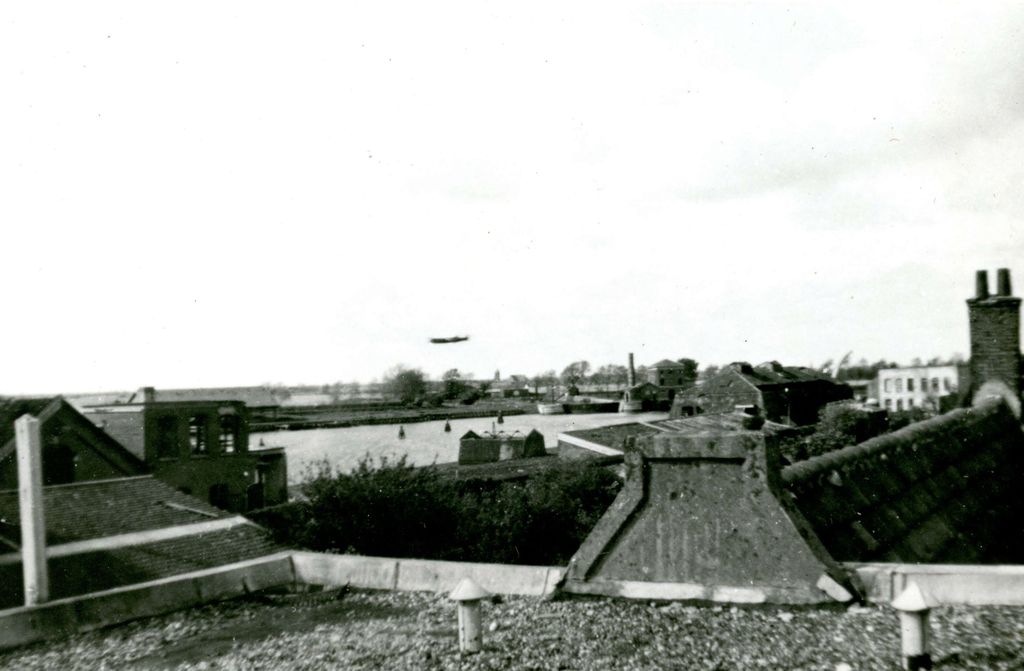Een vliegtuig vliegt laag over de Vesting, gezien vanaf het dak van het postkantoor; ca. 1945