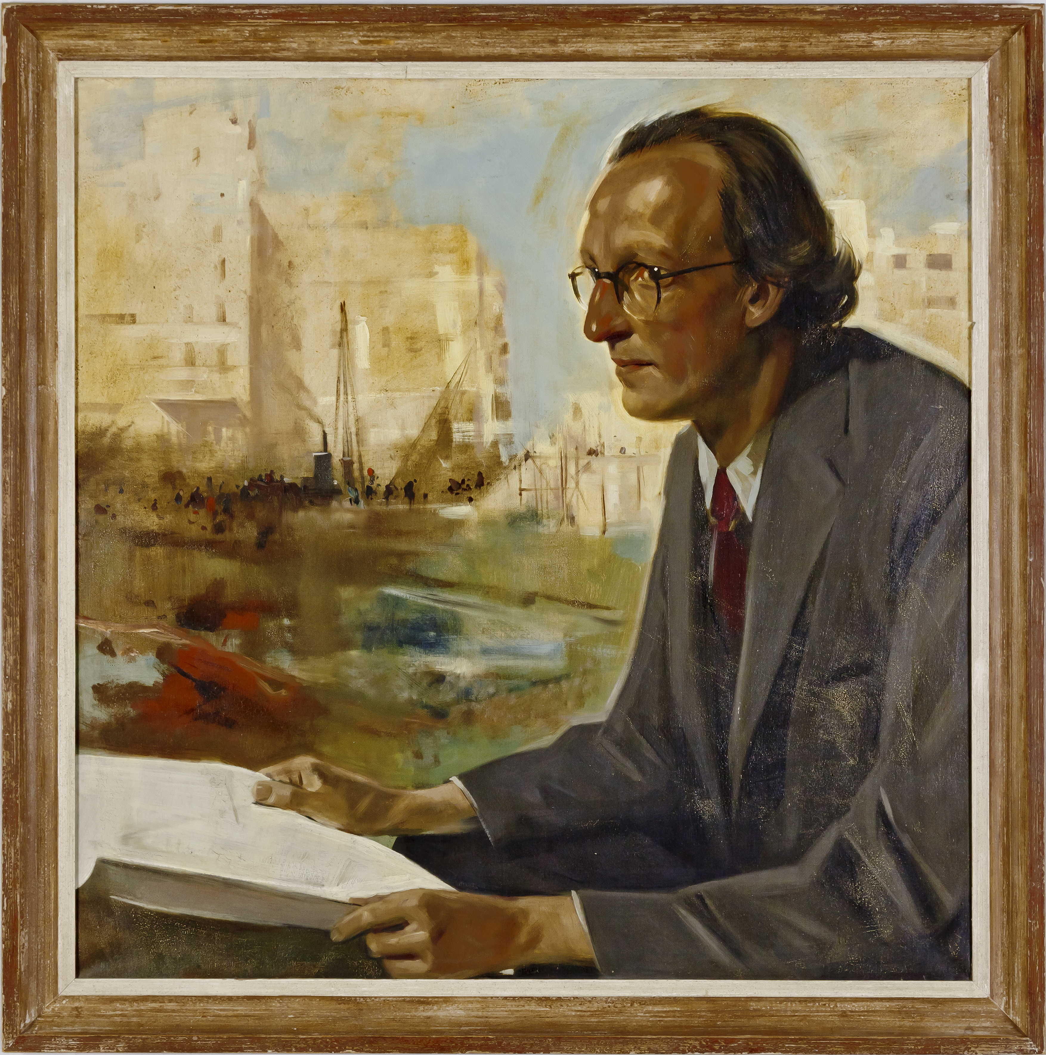 Portret van Liduina die een bezwerend gebaar maakt tegen het bombarderen van Schiedam. Linksonder de Frankelandse kerk, de Grote of St. Janskerk en de Havenkerk. Daaronder het stadswapen van Schiedam en de datum 14 mei 1940.