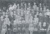 Een grote groep leerlingen naast de Oranjeschool. Tegen de muur staat schoolhoofd de Jong en links achter meester Wonink. Voor meester Wonink zit meester Wagenvoorde. De naam van de andere leerkracht is niet bekend. Op de voorste rij de eerste zittend van links is Gerrit Jan (Jan) Hegeman, Biesterij 1 Rijssen
