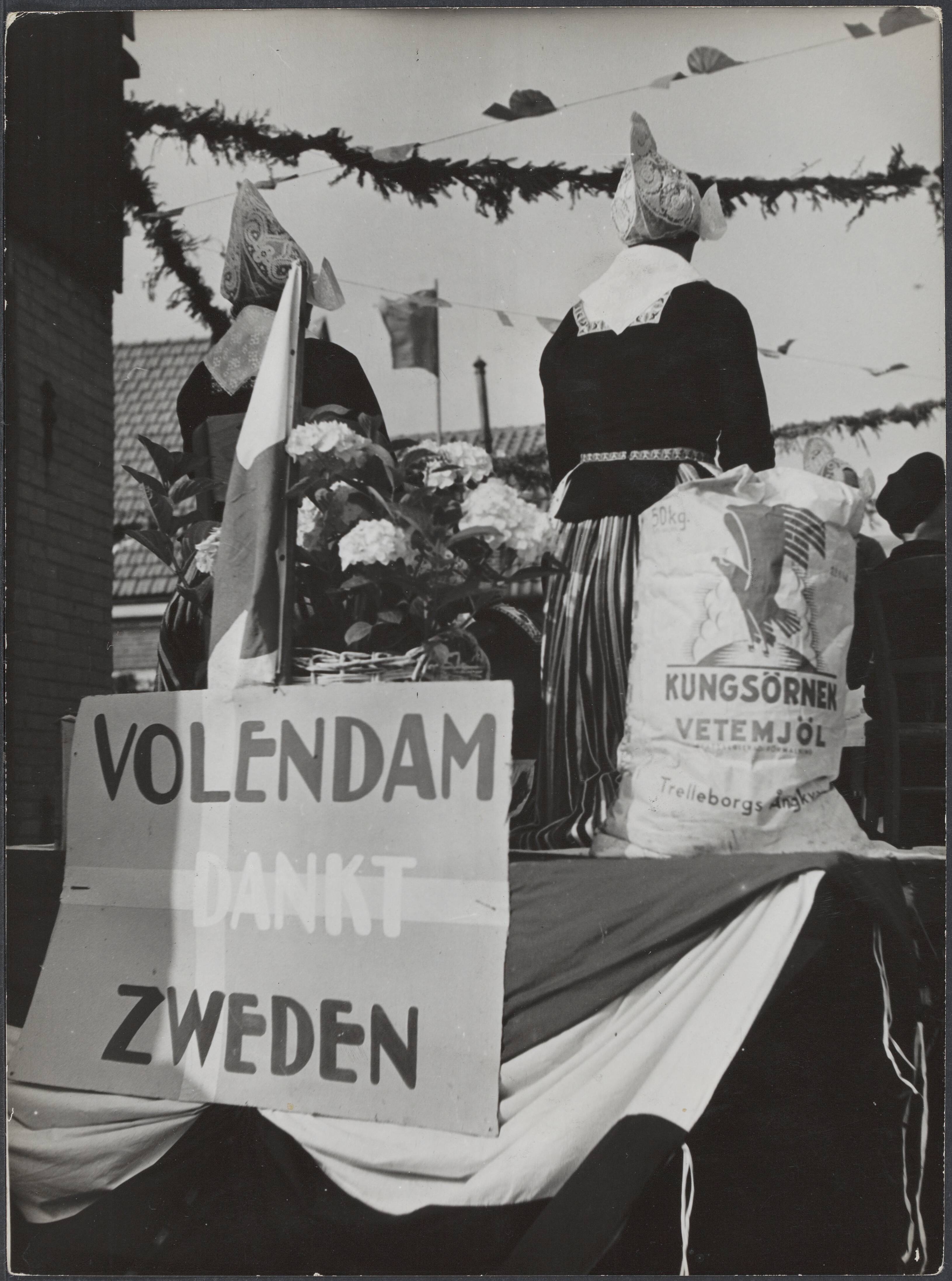 Feestelijkheden in Volendam na de bevrijding. Volendamse vrouwen met door het Zweedse Rode Kruis gedoneerd tarwemeel