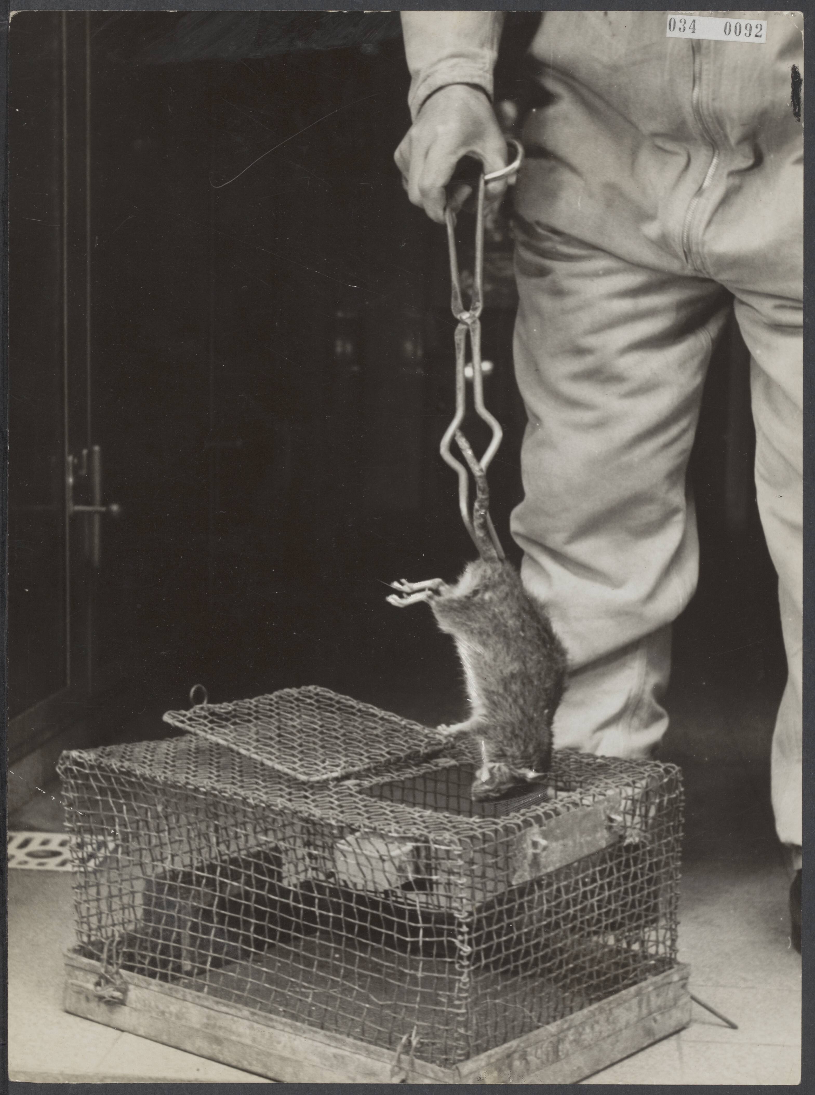 De strijd tegen het rattengevaar. Met een bijzonder gevormde tang neemt de oppasser een juist ingeleverde rat voor de proefnemingen uit de kooi