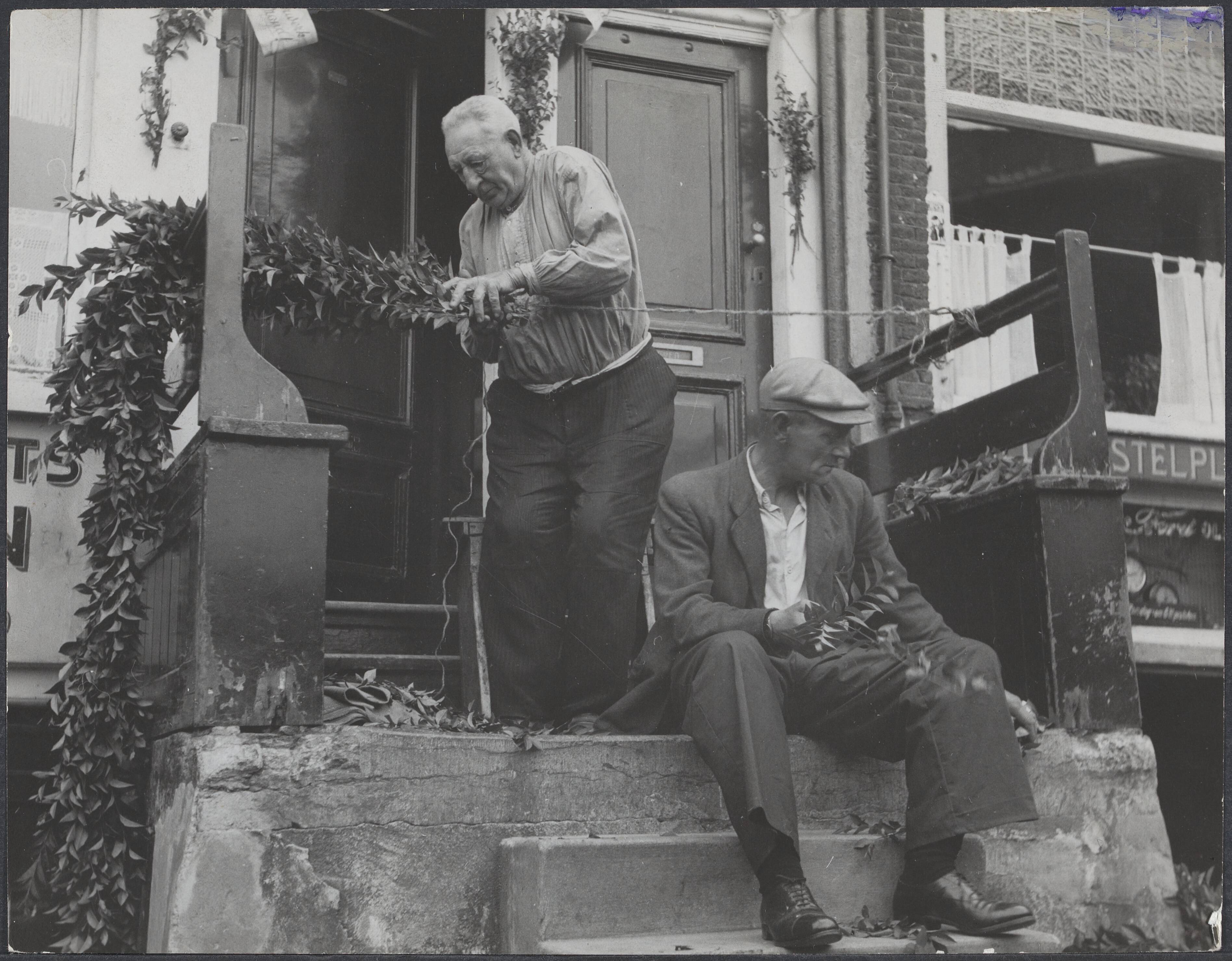 Tijdens de bevrijding aan het einde van de Tweede Wereldoorlog zijn Amsterdammers in de Jordaan hun woning aan het versieren voorafgaand aan de intocht der bevrijders
