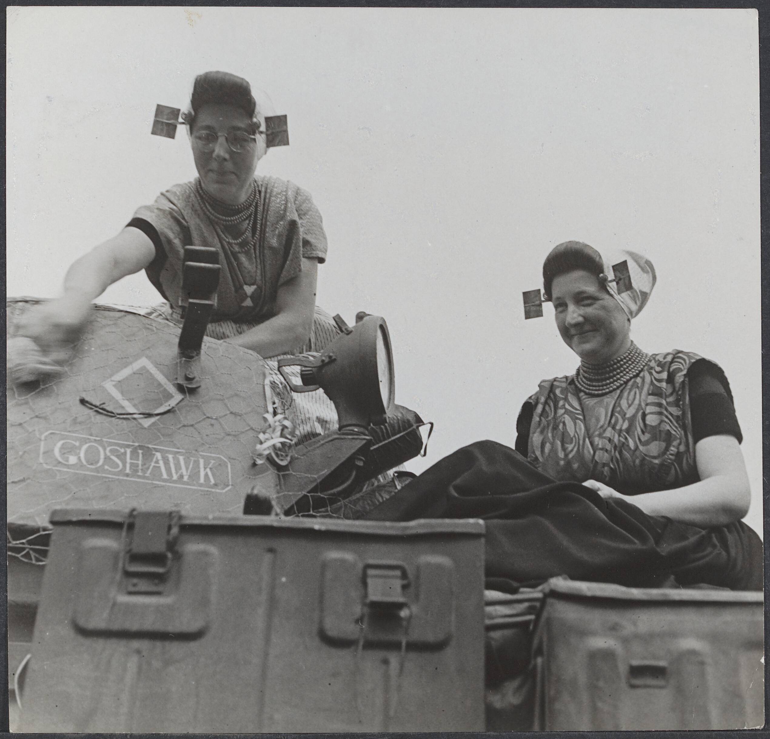 Bevrijdingsvreugde in Amersfoort. Vrouwen uit Bunschoten in klederdracht poetsen een pantservoertuig op