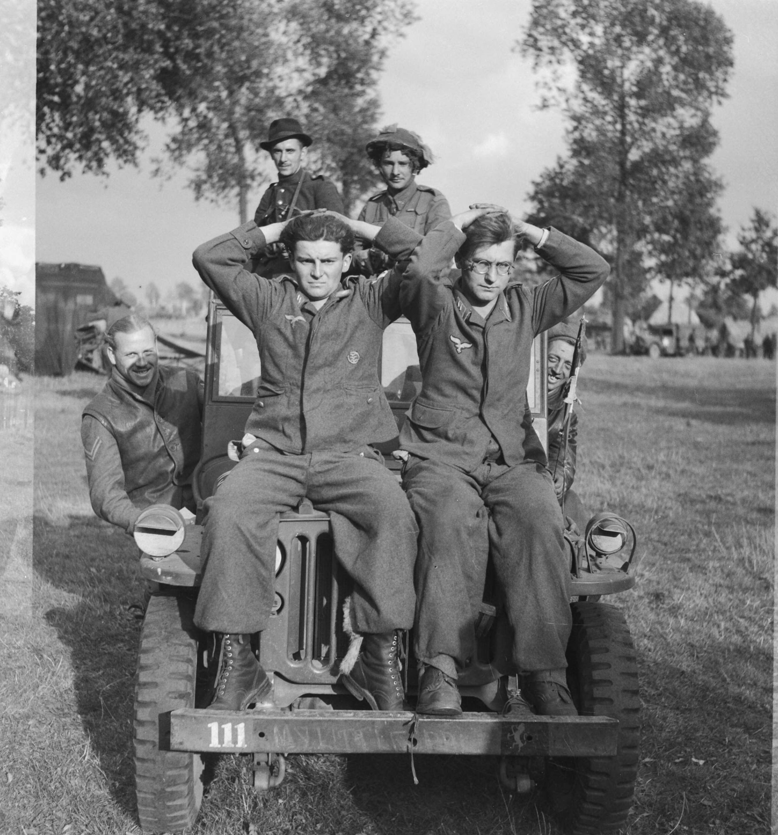 Prinses Irene Brigade in België. Bij het Albertkanaal. Twee Duitse krijgsgevangenen worden opgebracht in een jeep