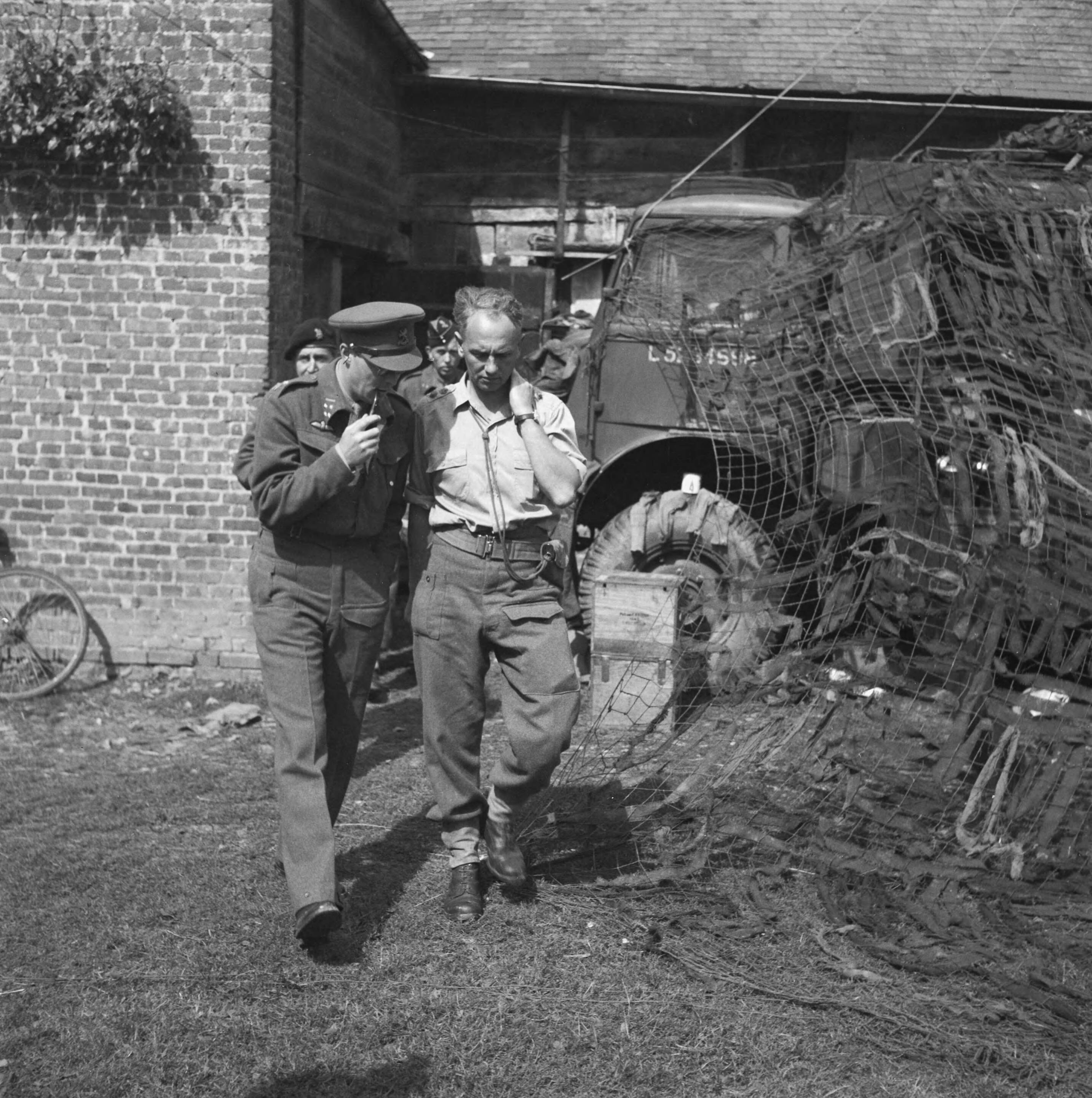 Prins Bernhard bij de Prinses Irenebrigade in Frankrijk. Bij het hoofdwartier