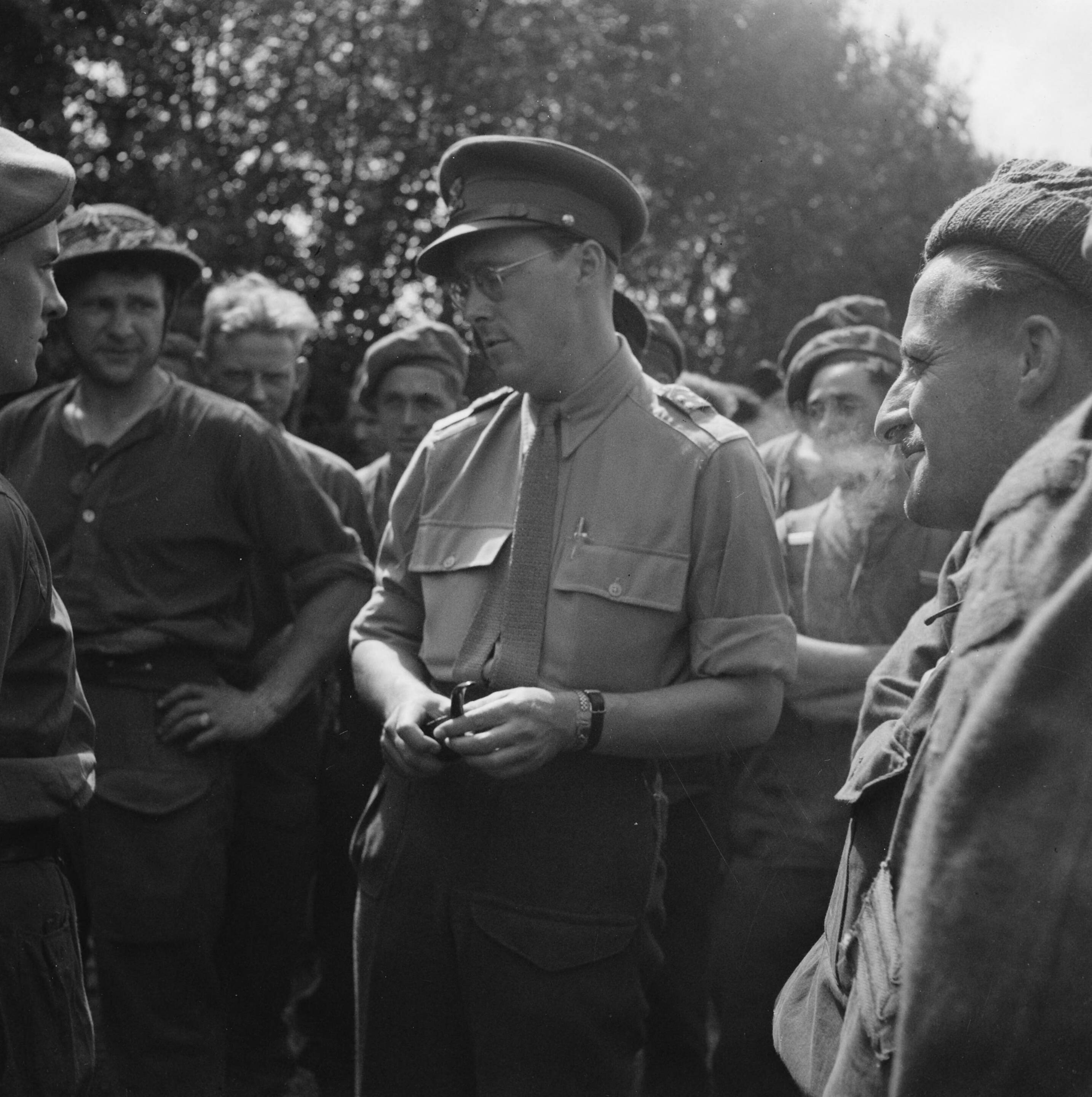 Prins Bernhard bij de Prinses Irenebrigade in Frankrijk. De prins spreekt met manschappen
