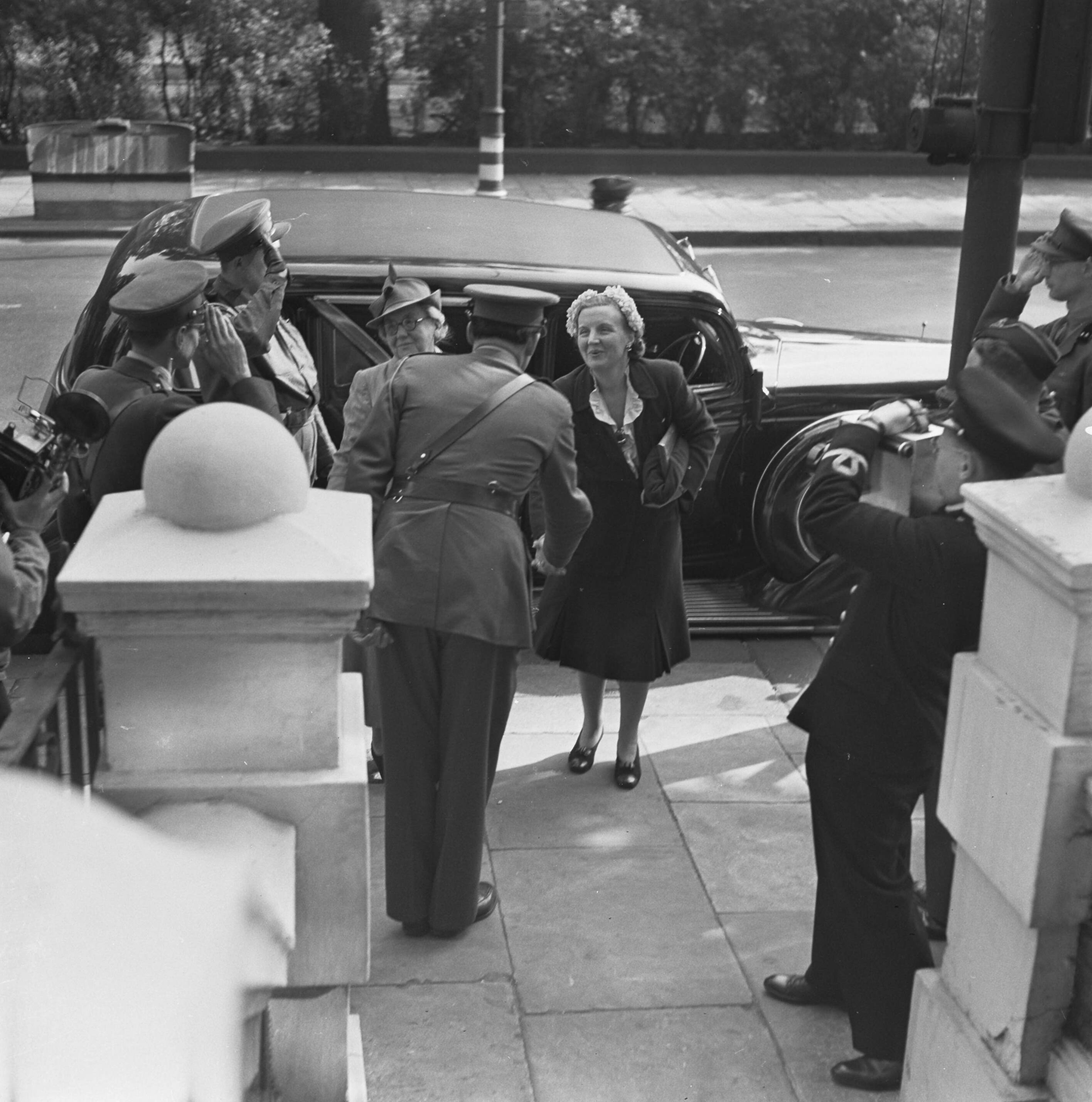 Koningin Wilhelmina en prinses Juliana arriveren bij "Oranjehaven" in Londen