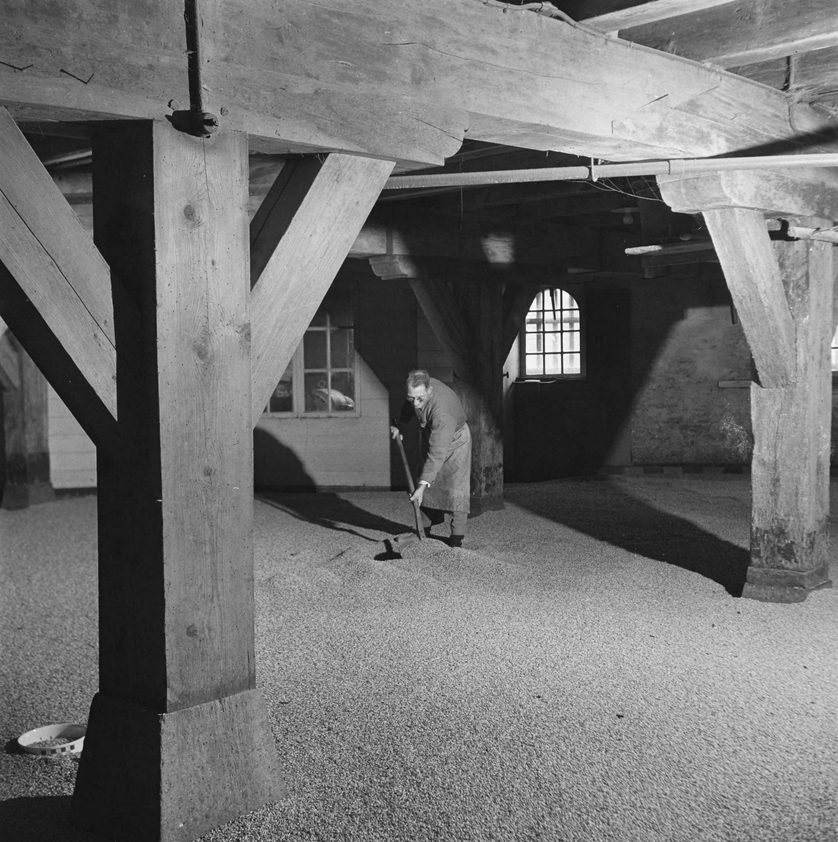 Een man schept graan op de graanzolder