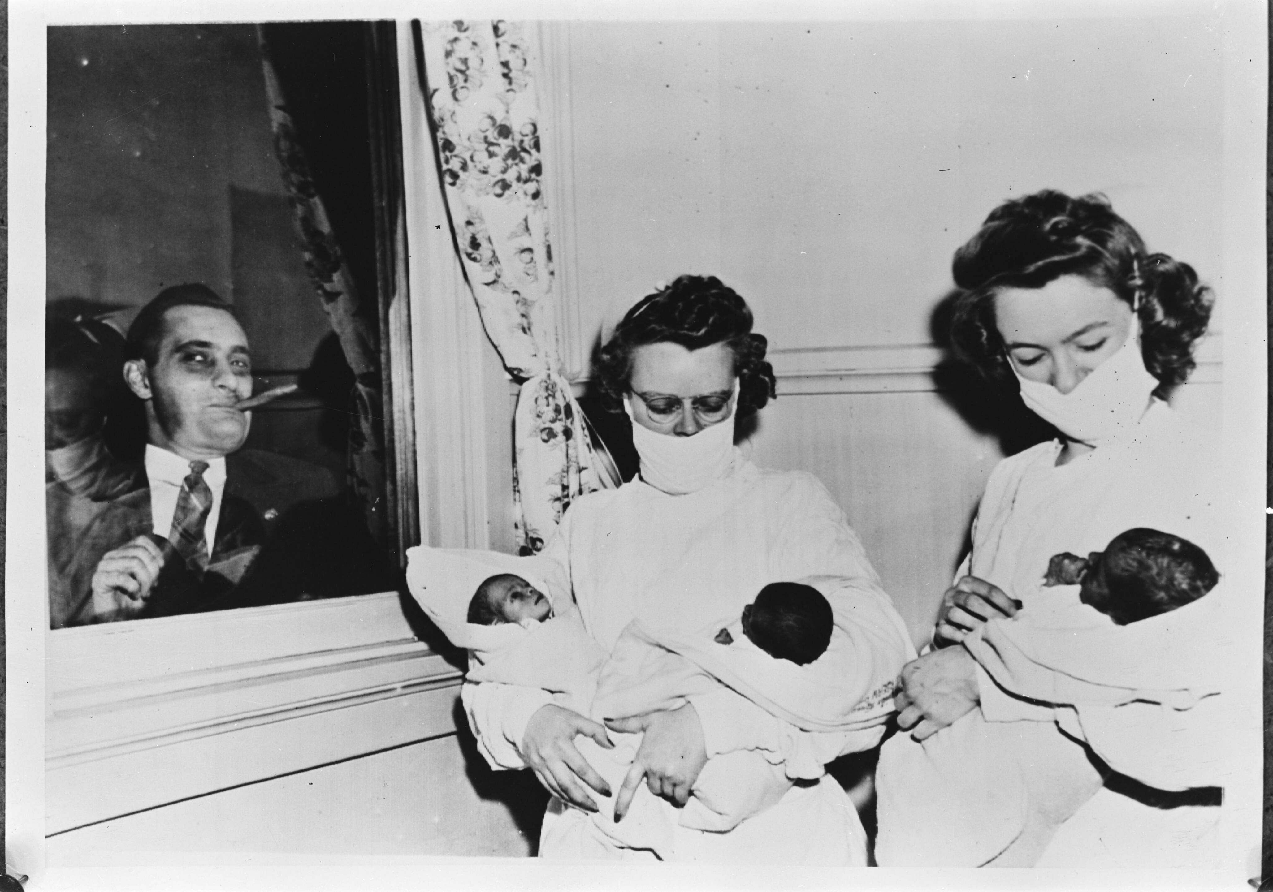 Drieling geboren vader, met sigaar, kijkt door raam