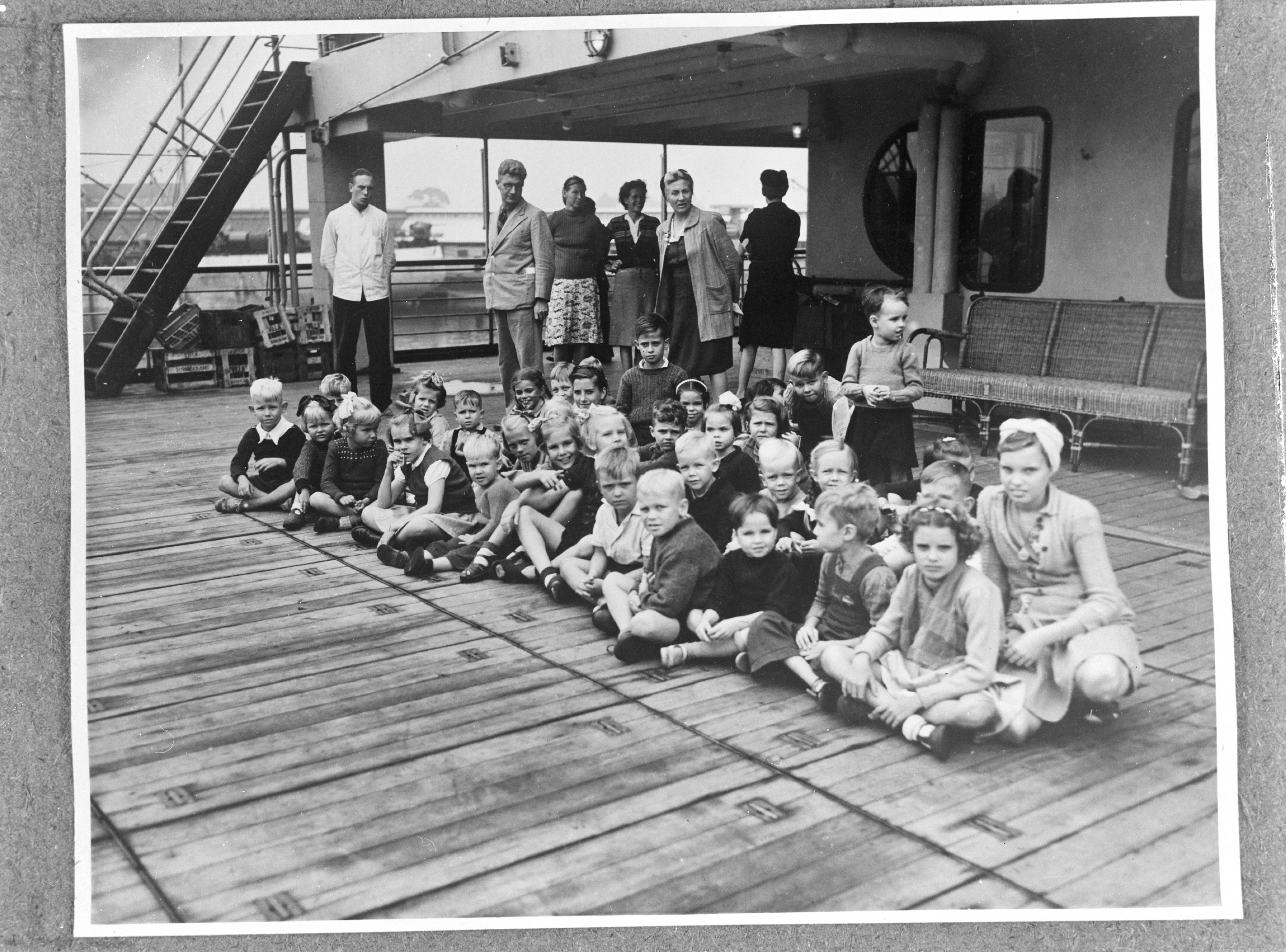 De "Oranjefontein" met aan boord Nederlandse geïnterneerden uit Japanse gevangenkampen in Batavia (Nederlands-Indië) arriveert in Melbourne op 27 oktober 1945. Nederlandse kinderen
