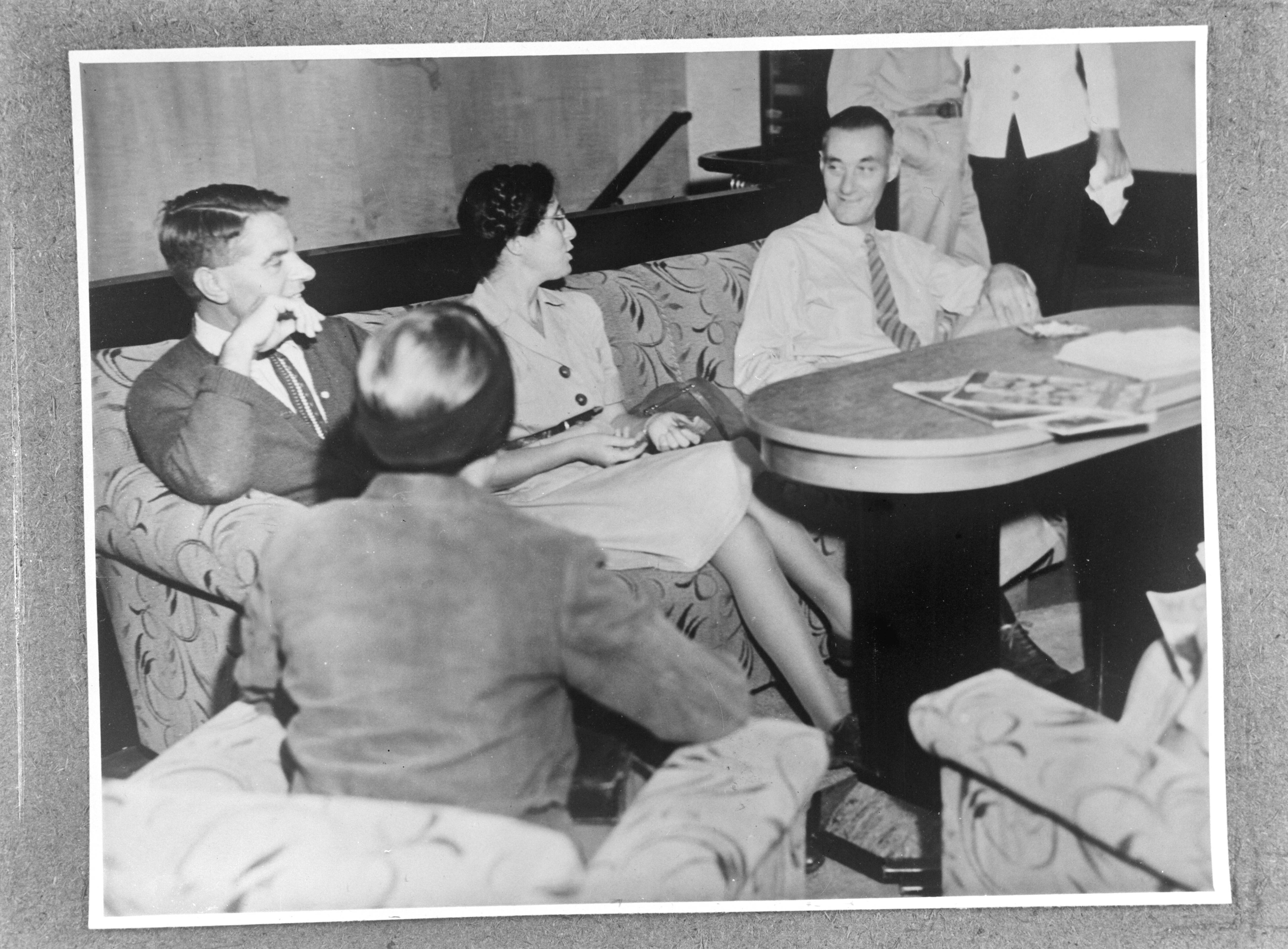 De "Oranjefontein" met aan boord Nederlandse geïnterneerden uit Japanse gevangenkampen in Batavia (Nederlands-Indië) arriveert in Melbourne op 27 oktober 1945. Enkele geïnterneerden in de lounge