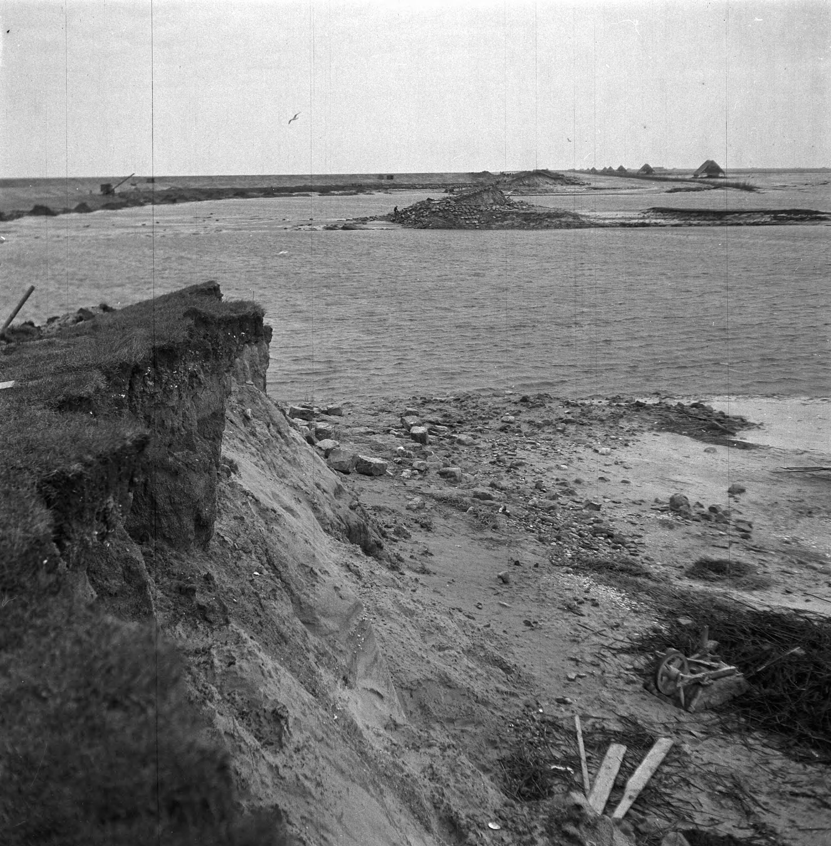 Wieringermeerpolder. Een van de gaten in de dijk gemaakt door de Duitsers in april 1945. Het tweede gat is zichtbaar in de verte
