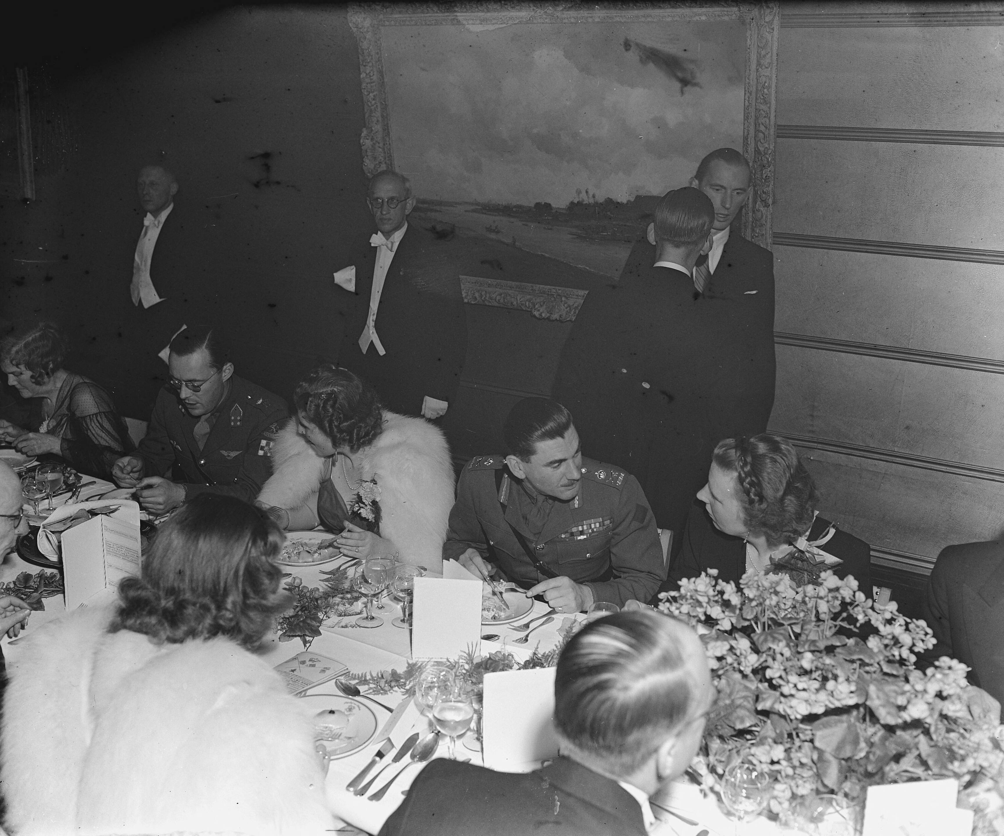Afscheidsdiner voor de Canadese luitenant-generaal G.G. (Guy Granville) Simonds links naast prinses Juliana