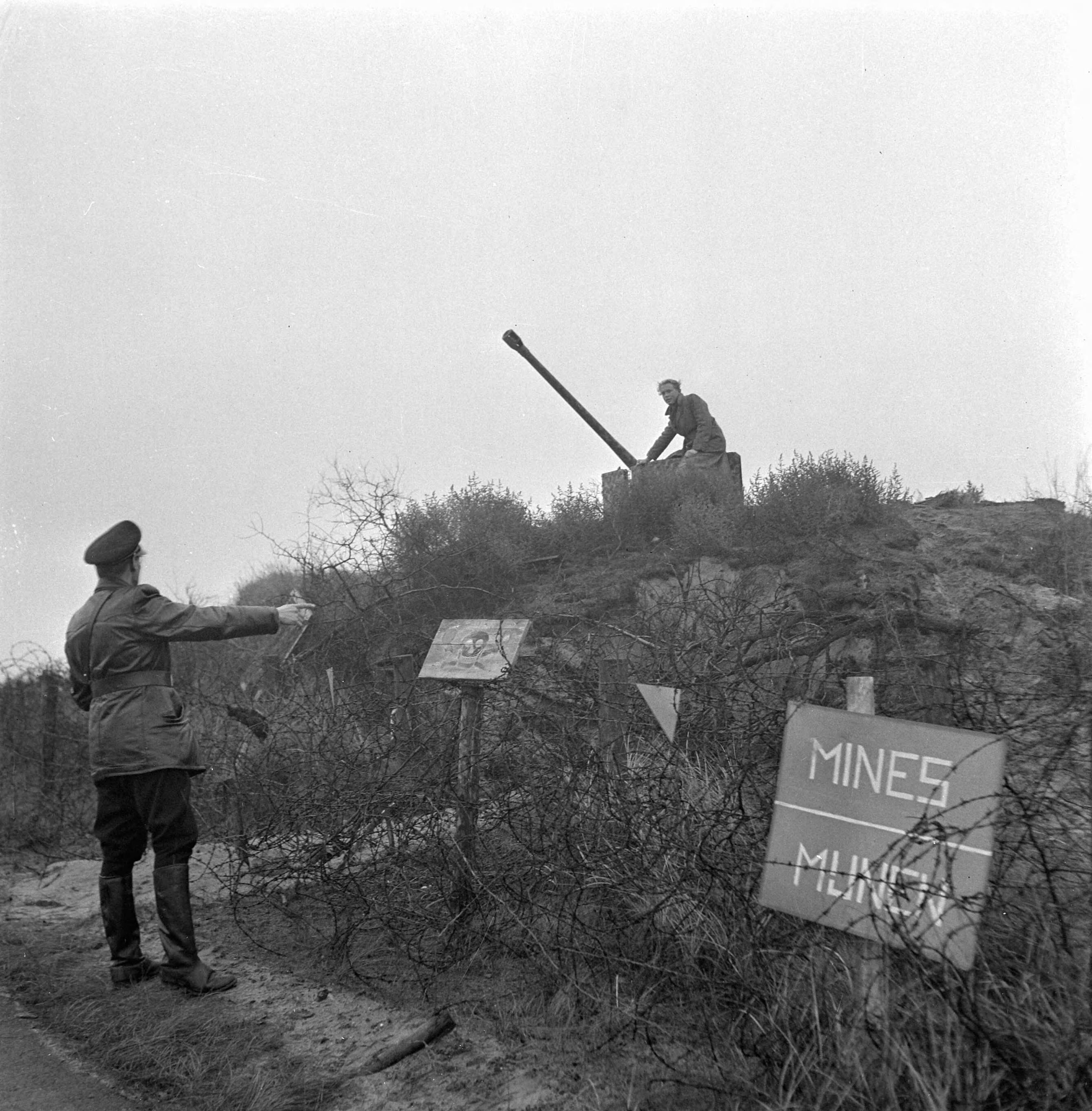 De Haagse politie en brandweer redden een jongen vanaf een voormalige Duitse bunker in een mijnenveld. Hij werd gered met de hulp van de Magirus autoladder van de Haagse brandweer