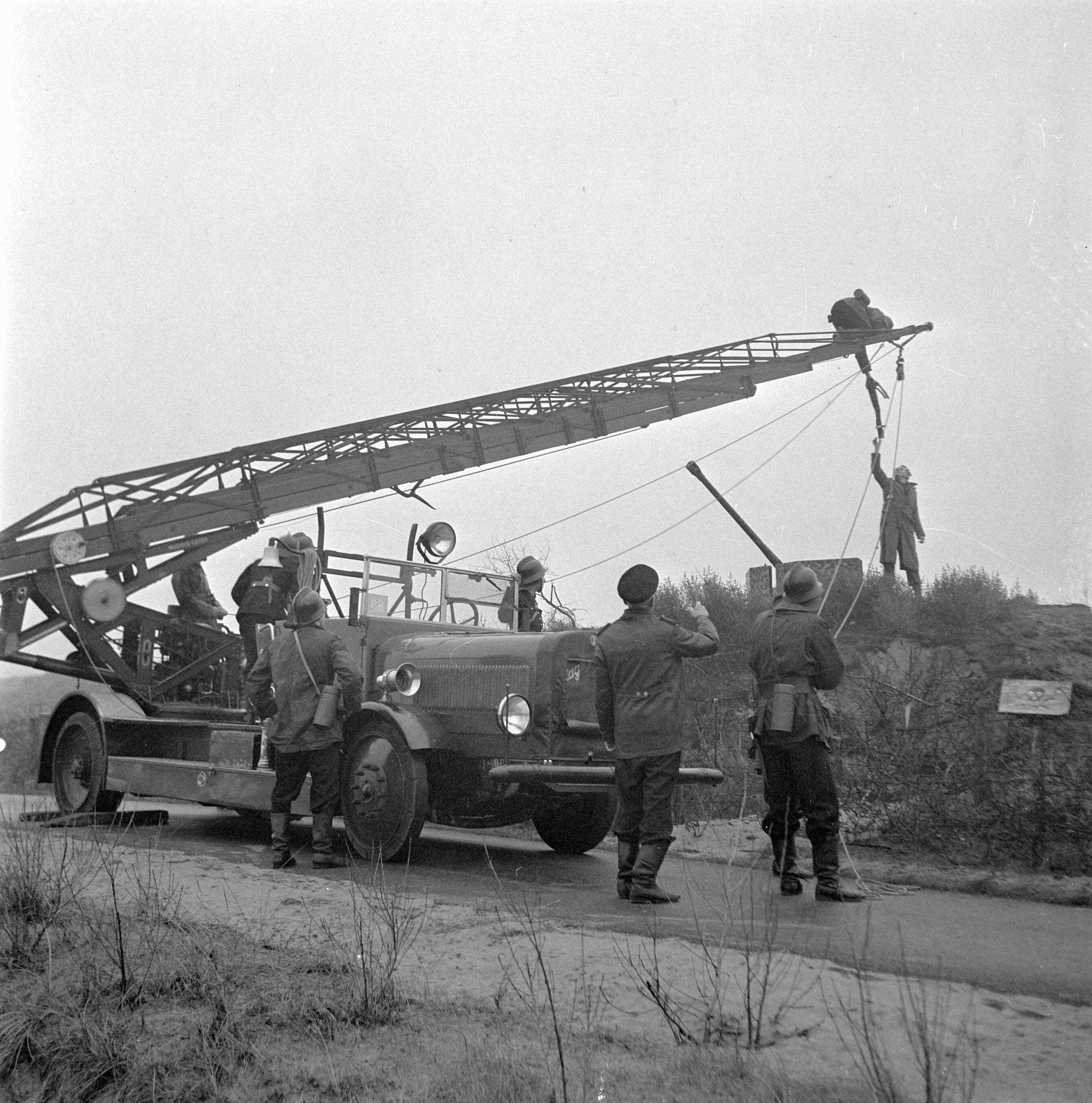 De Haagse politie en brandweer redden een jongen vanaf een voormalige Duitse bunker in een mijnenveld. Hij werd gered met de hulp van de Magirus autoladder van de Haagse brandweer