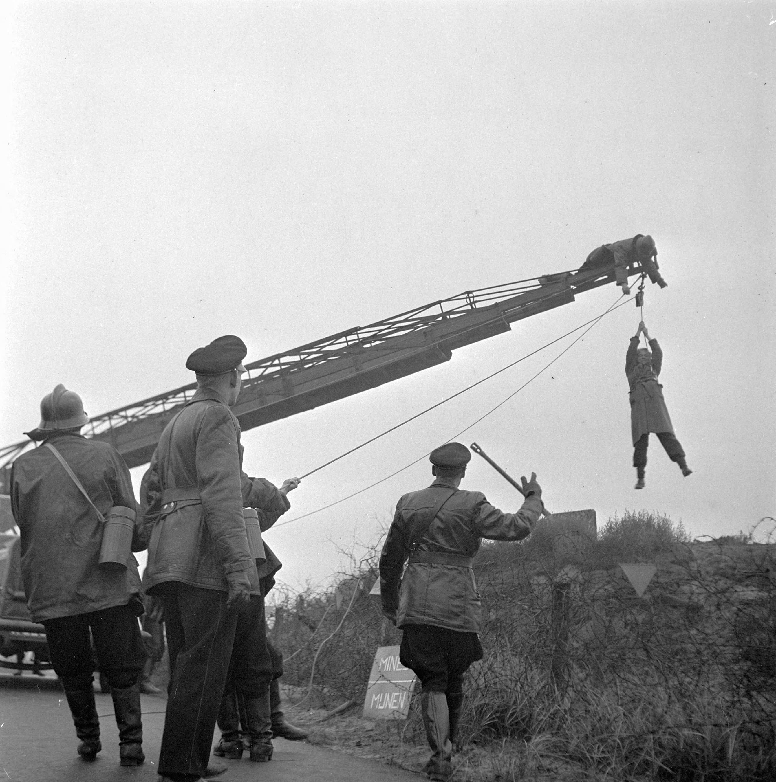 Rijkspolitie spreekt kinderen toe, die oorlogswerktuigen van de slagvelden in Zuid Nederland opraapten, welke zij in moesten lever...