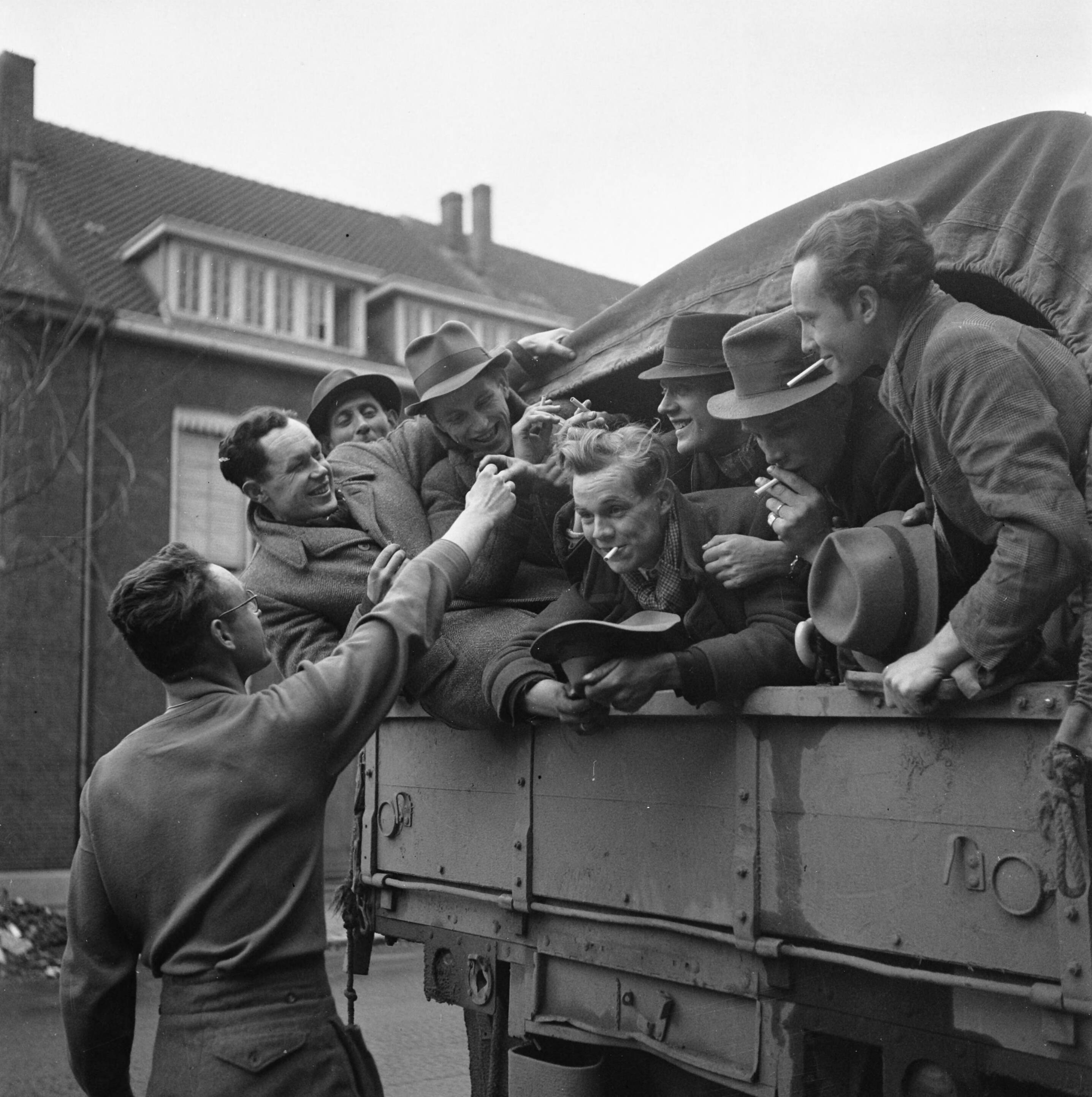De bevolking van Roermond keert naar huis terug op Amerikaanse legertrucks.