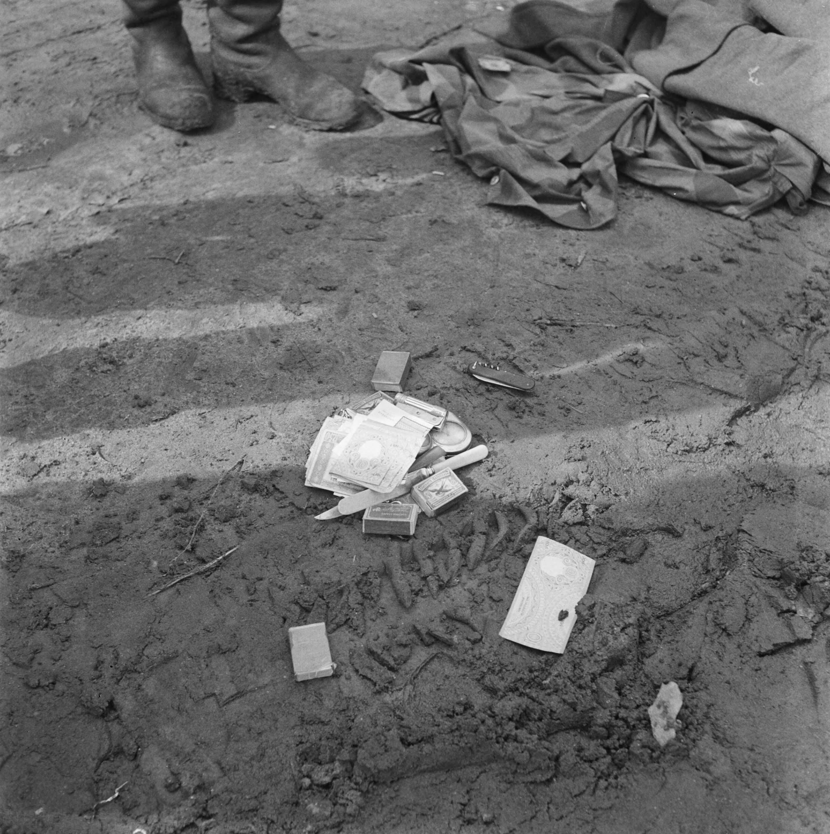Persoonlijke bezittiingen van krijgsgevangen Duitse soldaten (Luftwaffe of Fallschirmjäger): mes, lucifers, bankbiljetten, horloge...