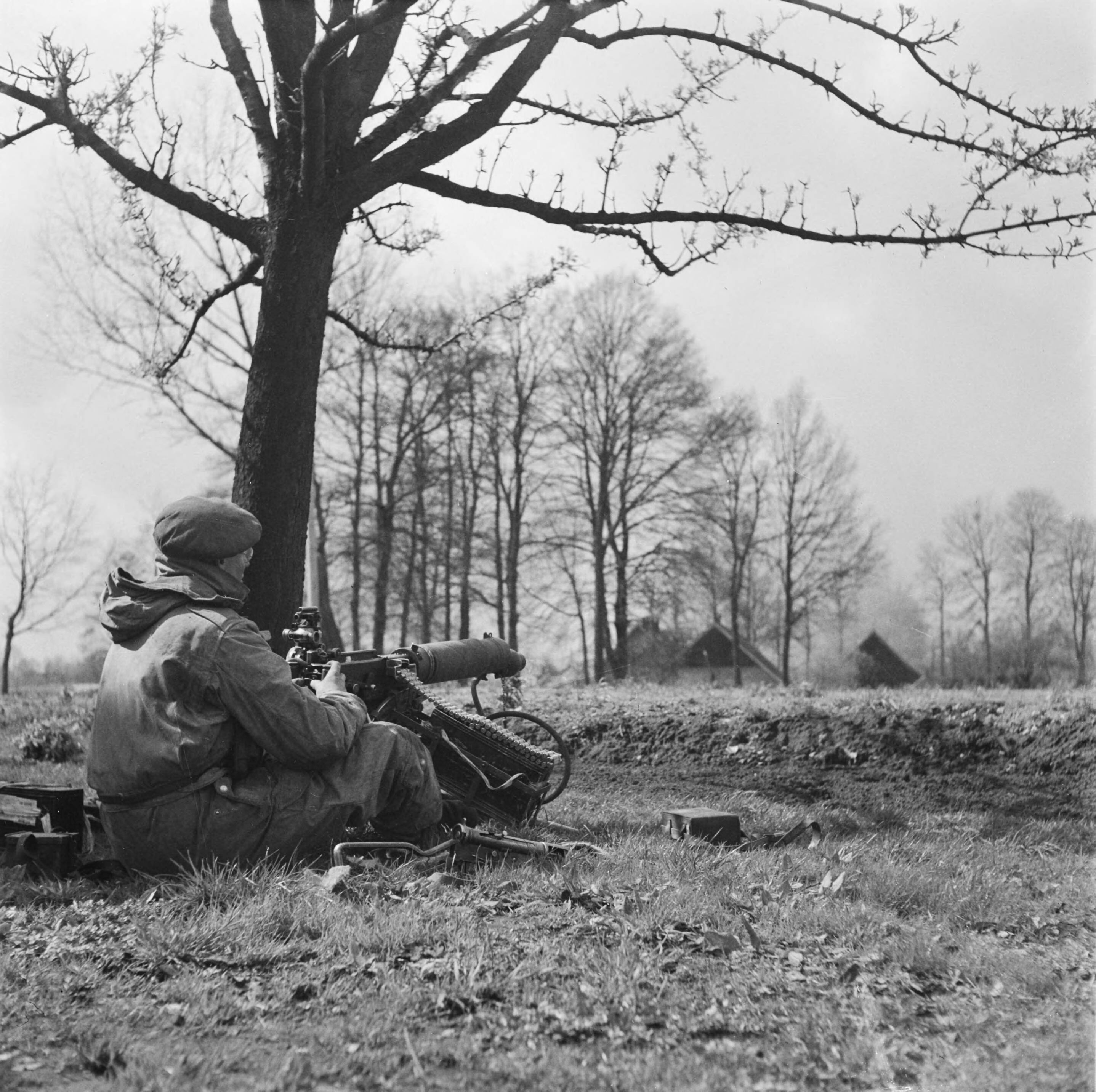 Een Britse mitrailleur (Vickers Maxim) in stelling vuurt op een boerderij