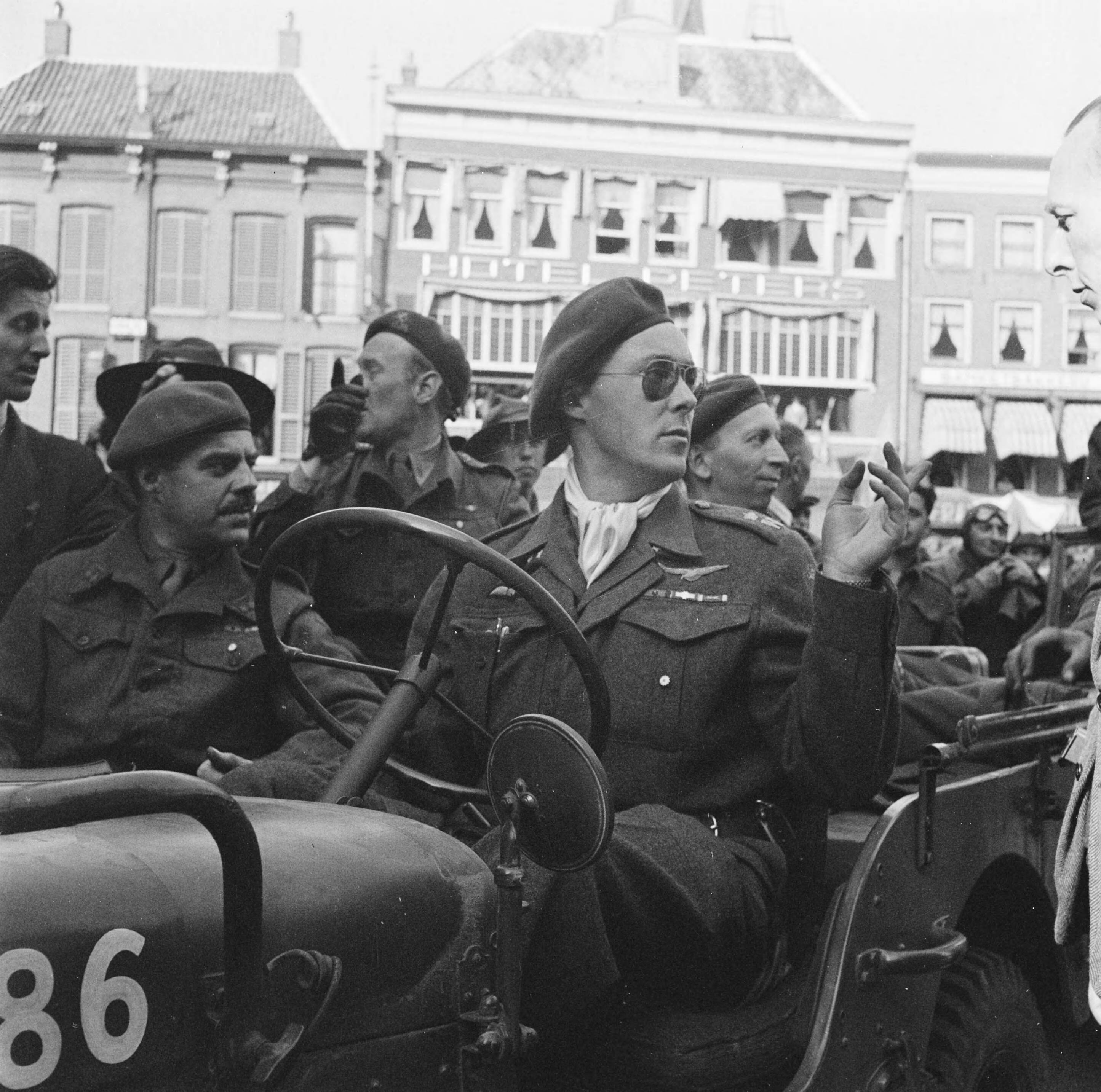 Prins Bernhard op de Grote Markt in Zwolle; op de achtergrond Hotel Peters.