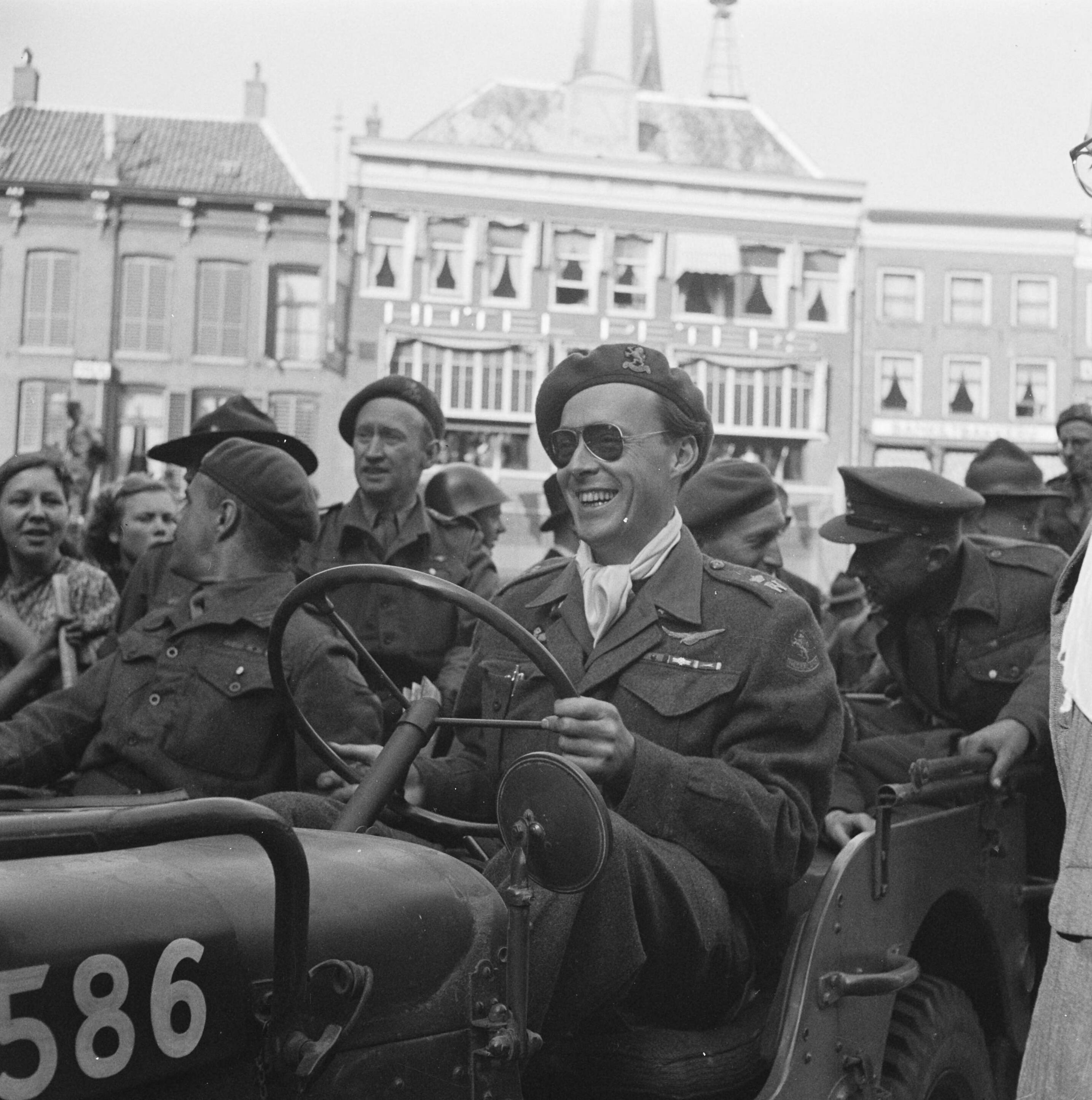 Prins Bernhard op de Grote Markt in Zwolle,; op de achtergrond Hotel Peters.