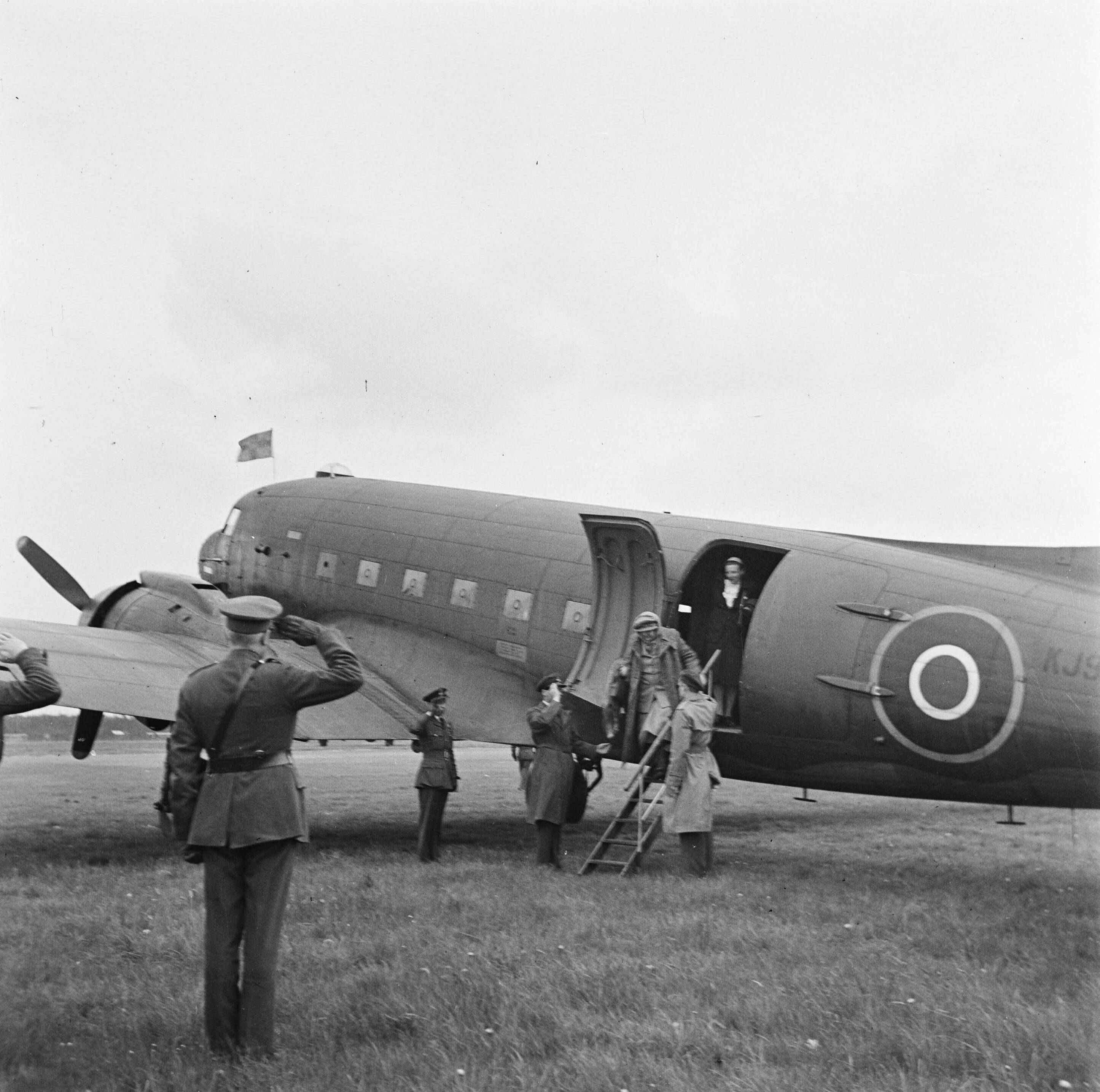 Aankomst van de Dakota op vliegveld Gilze-Rijen, de koningin stapt uit, gevolgd door prinses Juliana. Links bij de vliegtuigtrap E. Hazelhoff Roelfzema, rechts P. Tazelaar