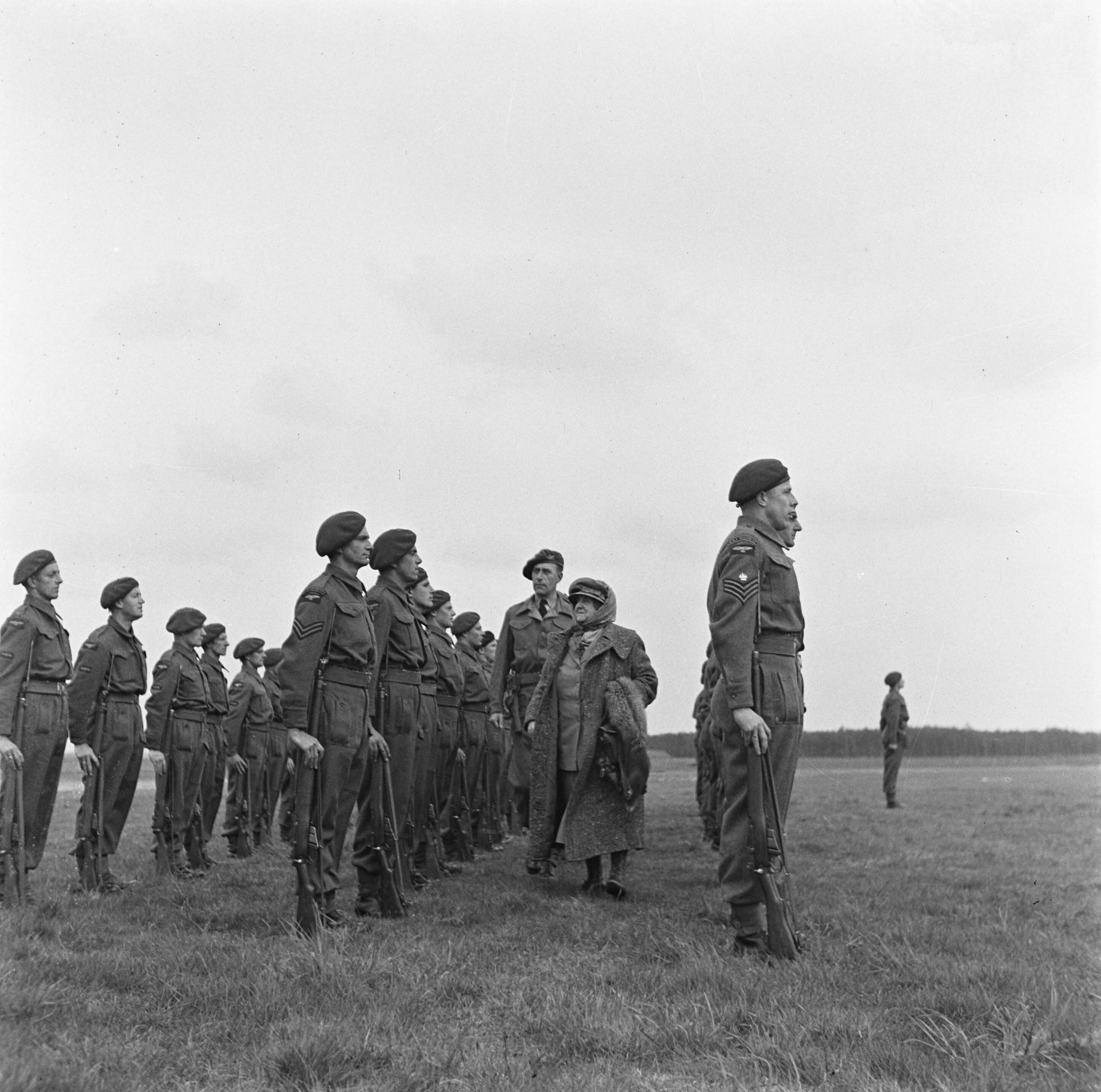 Ontvangst op vliegveld Gilze-Rijen. De Britse erewacht op het vliegveld Gilze-Rijen wordt geinspecteerd door de koningin.