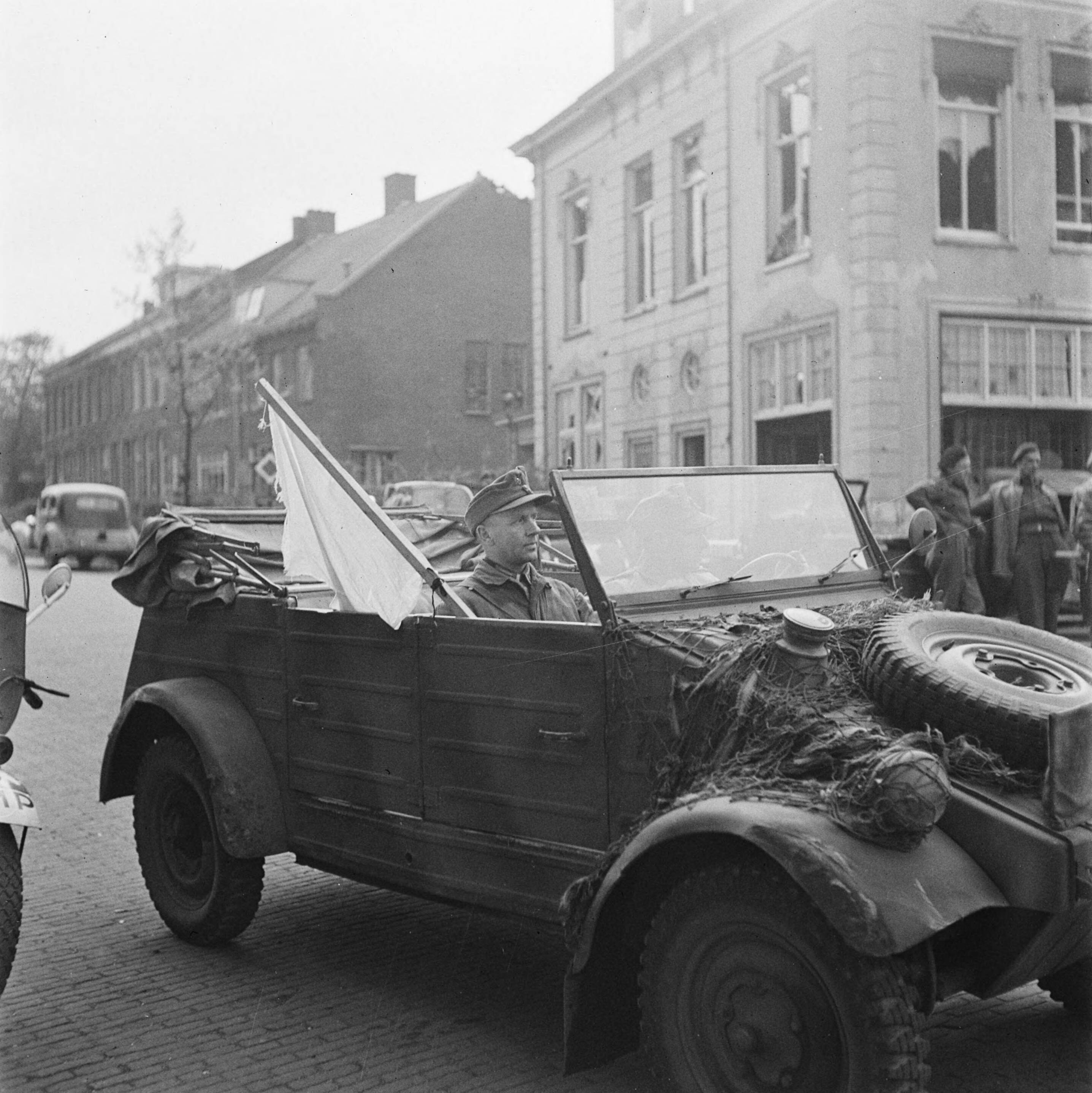 Voorbereidingen en onderhandelingen tot de capitulatie in Wageningen. Aankomst van de Duitse onderhandelingsdelegatie (met witte vlag).