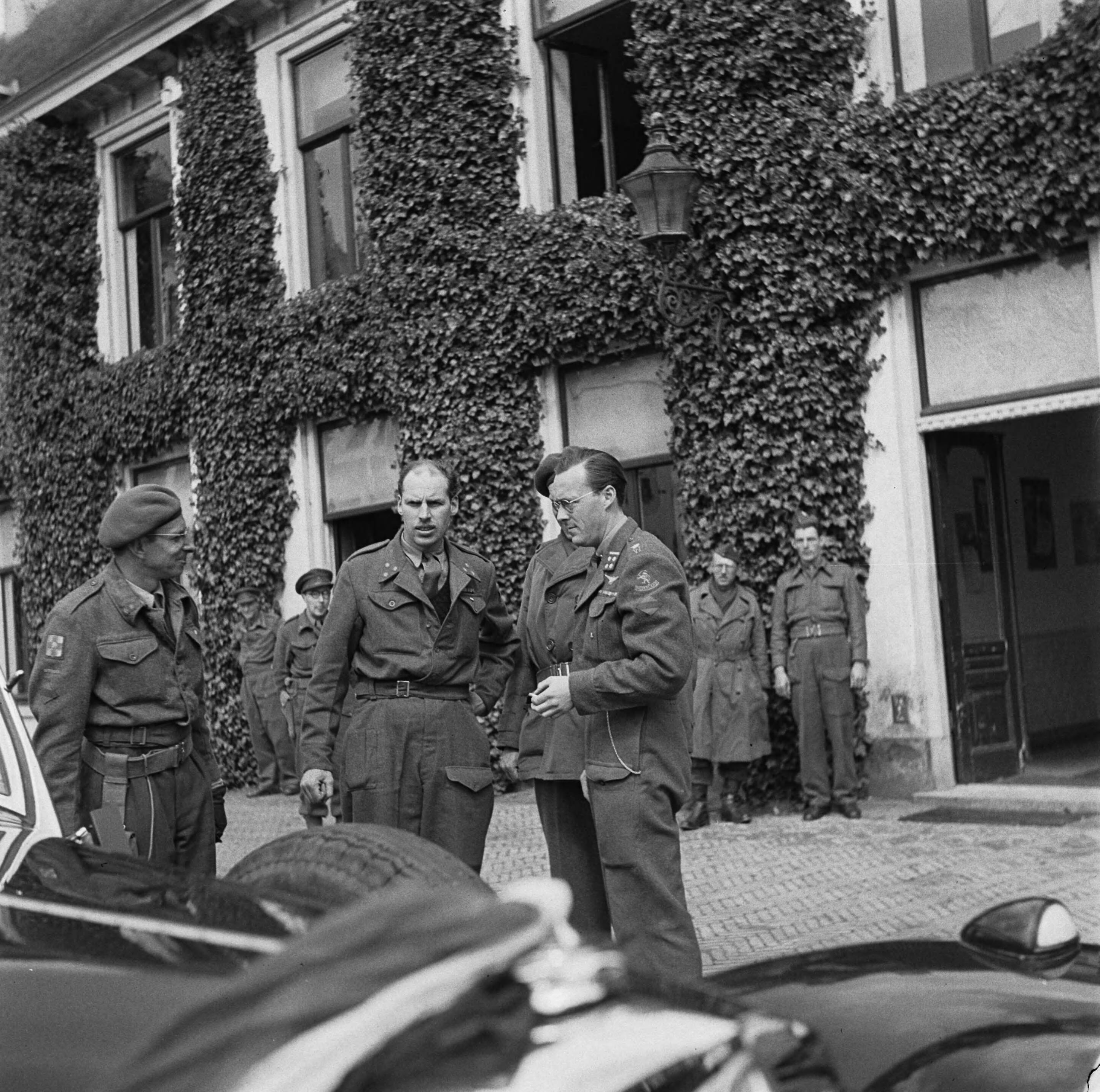 Voorbereidingen en onderhandelingen tot de capitulatie in Wageningen. Prins Bernhard bij Paleis het Loo te Apeldoorn