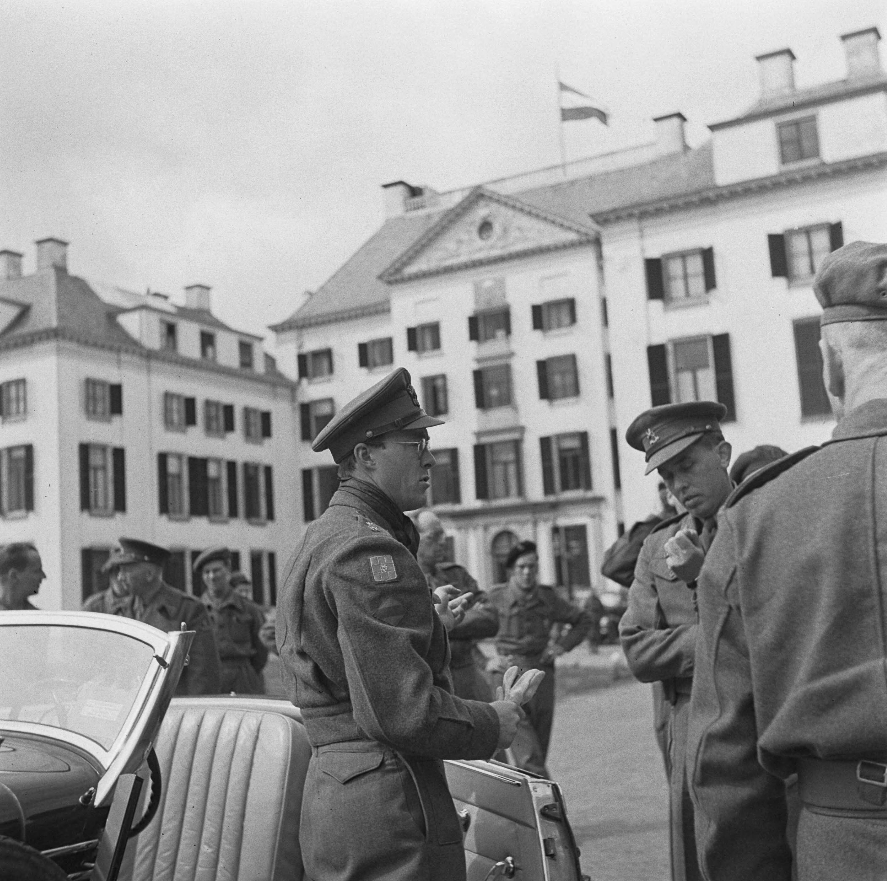 Voorbereidingen en onderhandelingen tot de capitulatie in Wageningen. Prins Bernhard bij Paleis het Loo te Apeldoorn, gereed voor vertrek naar Wageningen