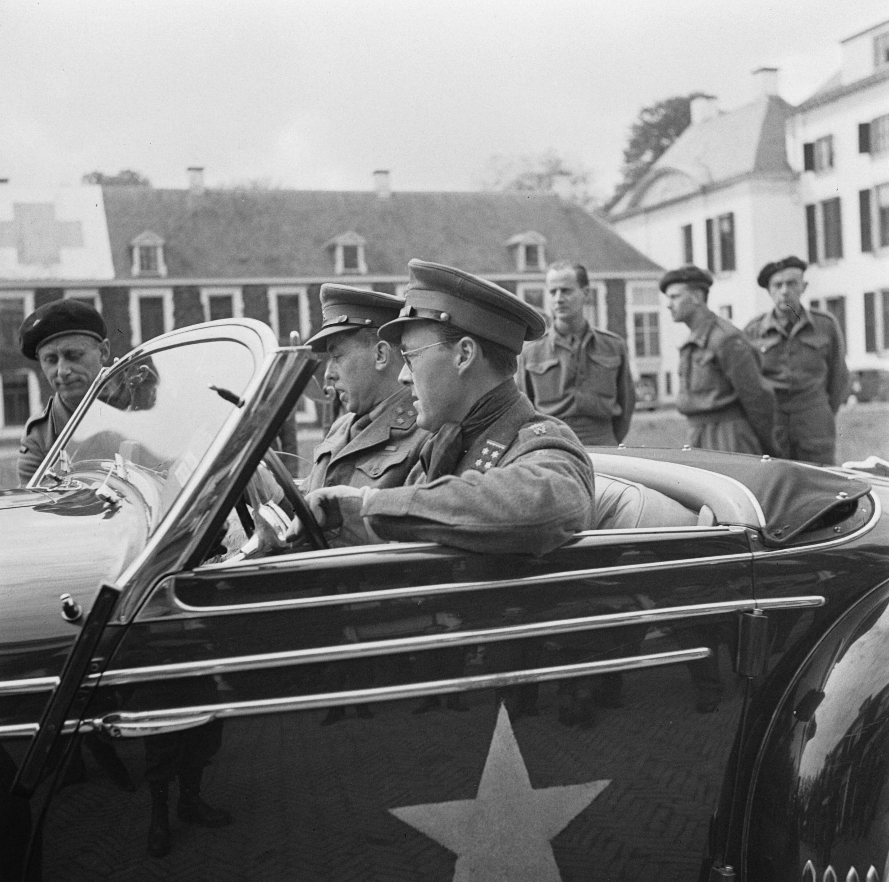 Voorbereidingen en onderhandelingen tot de capitulatie in Wageningen. Prins Bernhard bij Paleis het Loo te Apeldoorn, gereed voor vertrek naar Wageningen