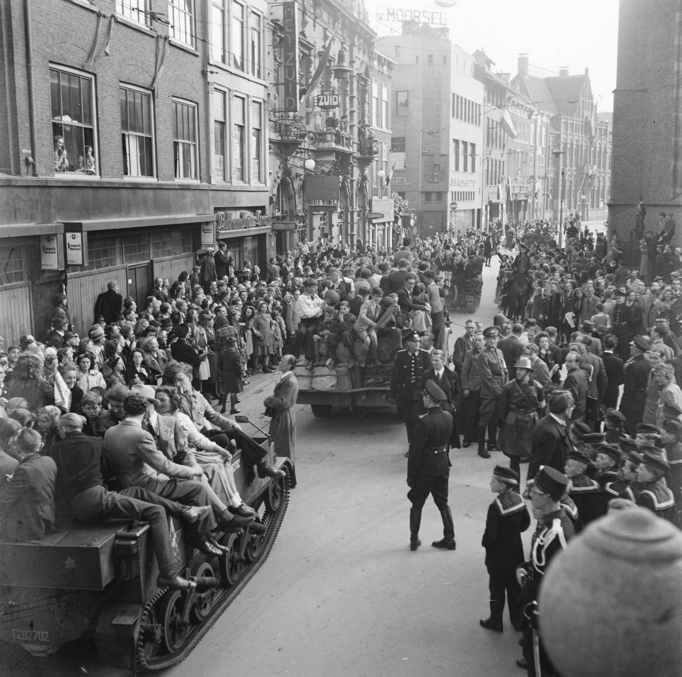 Bevrijdingsfeest in Den Haag. Met burgers volgepakte Canadese voertuigen voor het stadhuis
