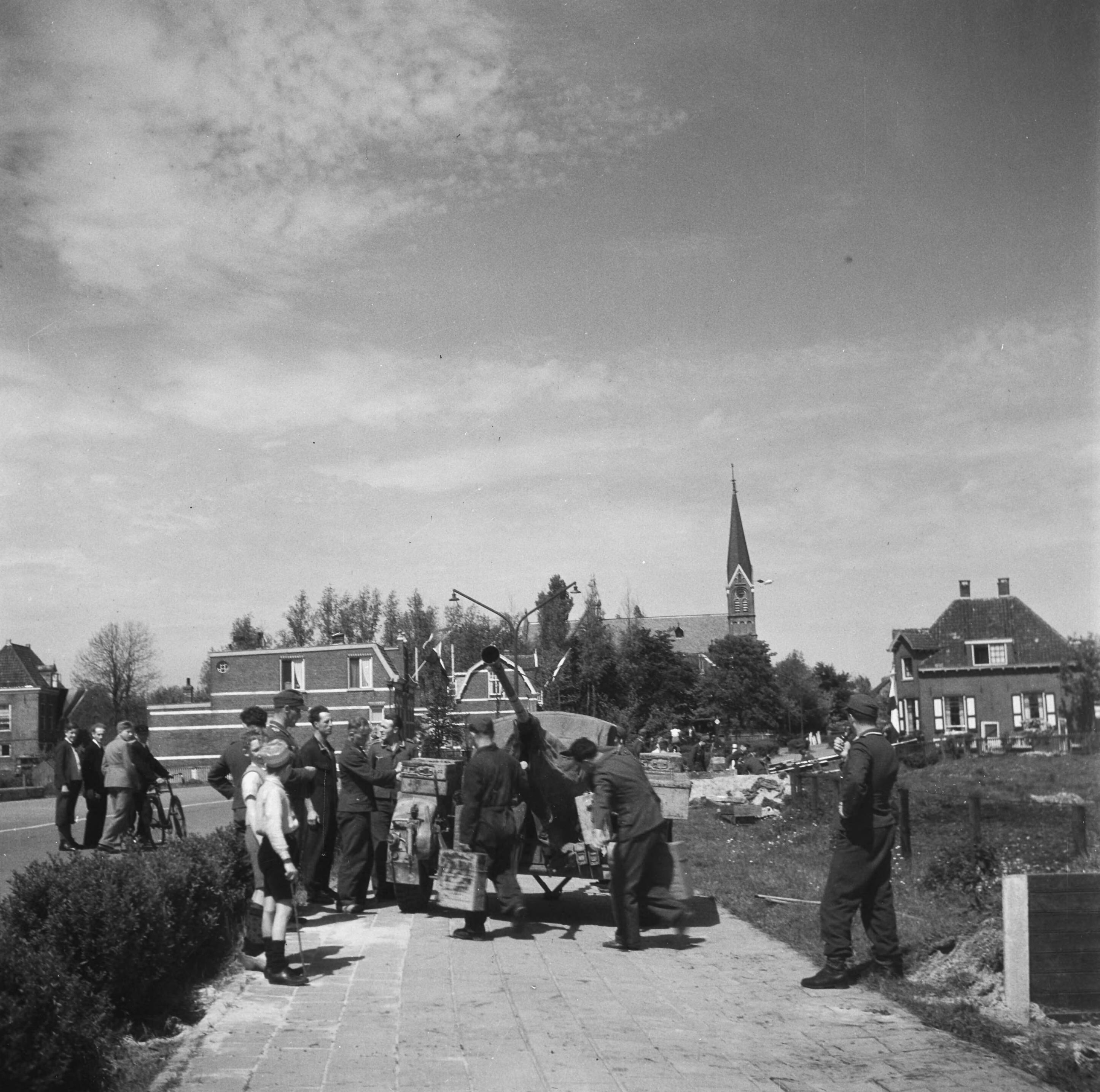 Inleveren van wapens door de Duitsers. Duitse soldaten verwijderen een 3,7cm luchtafweer kanon uit een stelling in de omgeving van Duivendrecht bj Amsterdam