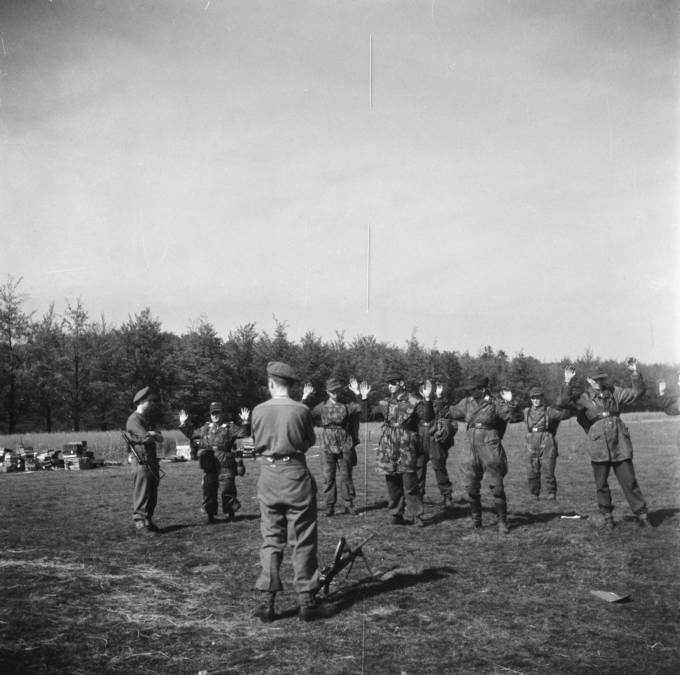 Inleveren van wapens door de Duitsers. Duitse soldaten in het wapendepot in Soest, waar de Duitsers hun wapens moeten inleveren