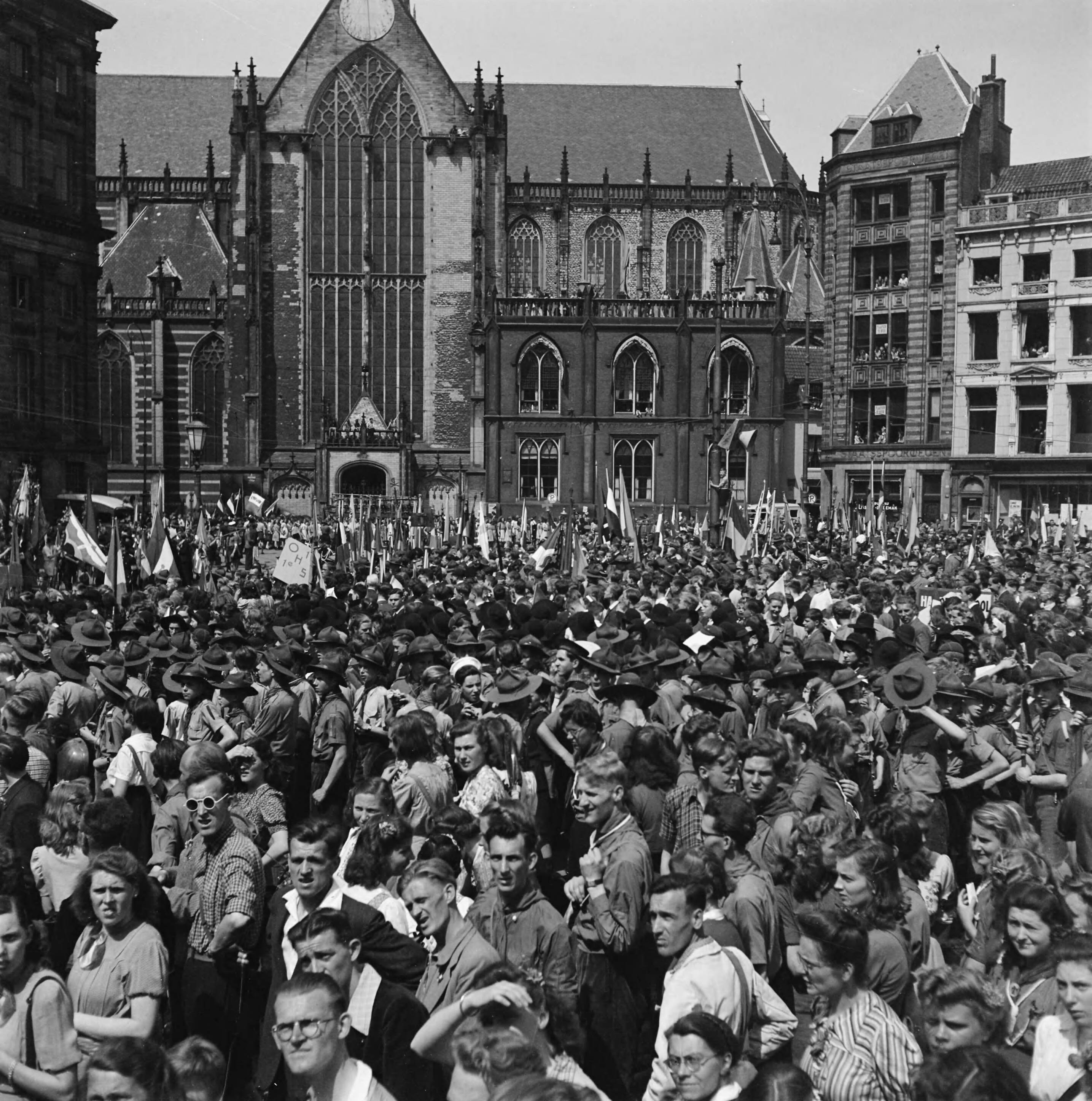 Jeugddemonstratie op de Dam te Amsterdam. Grote menigte op de Dam te Amsterdam
