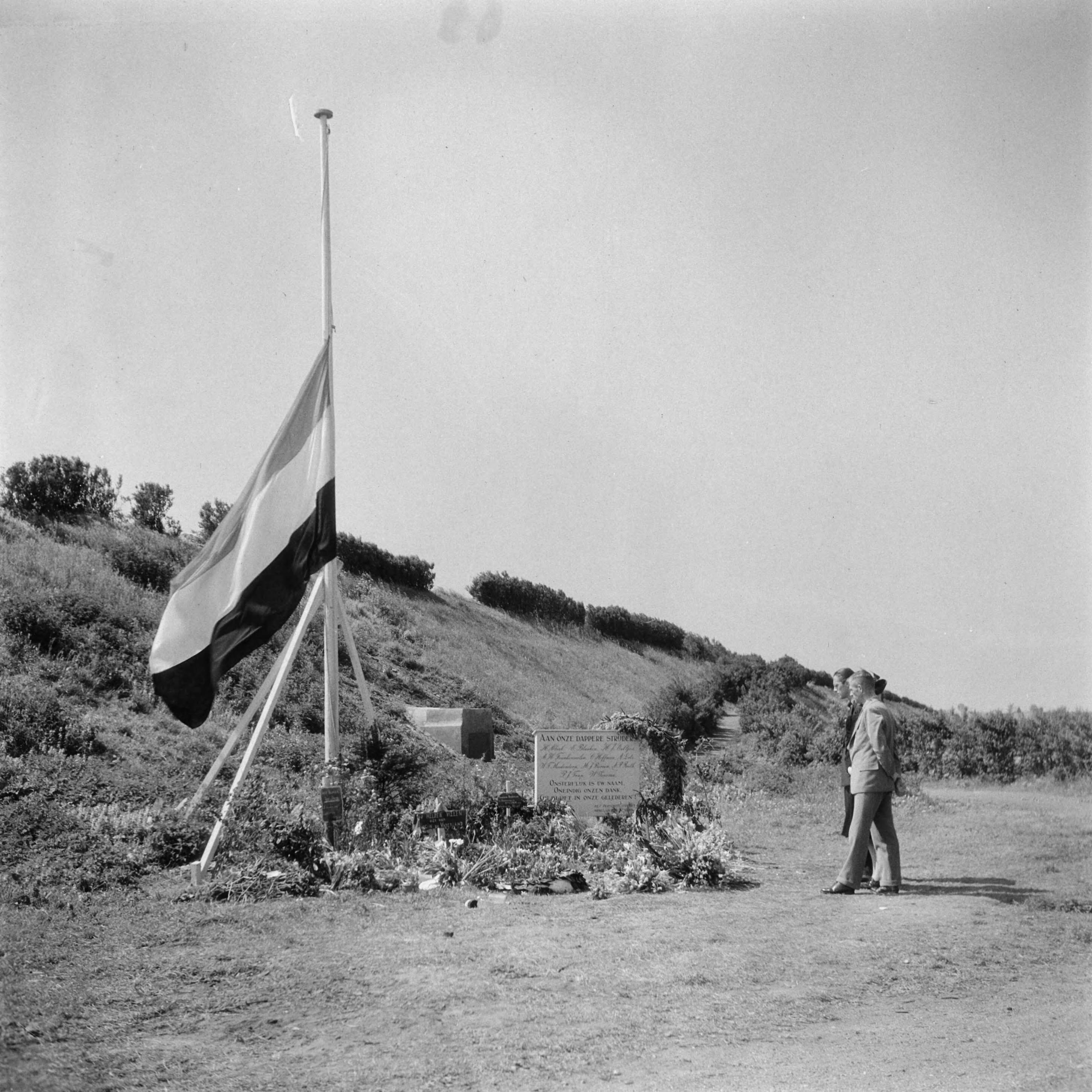 Tijdelijke begraafplaats Bloemendaa. Vlaggenmast met vlag halfstok en bord met opschrift zie foto 900-2316. Twee mannen kijken toe