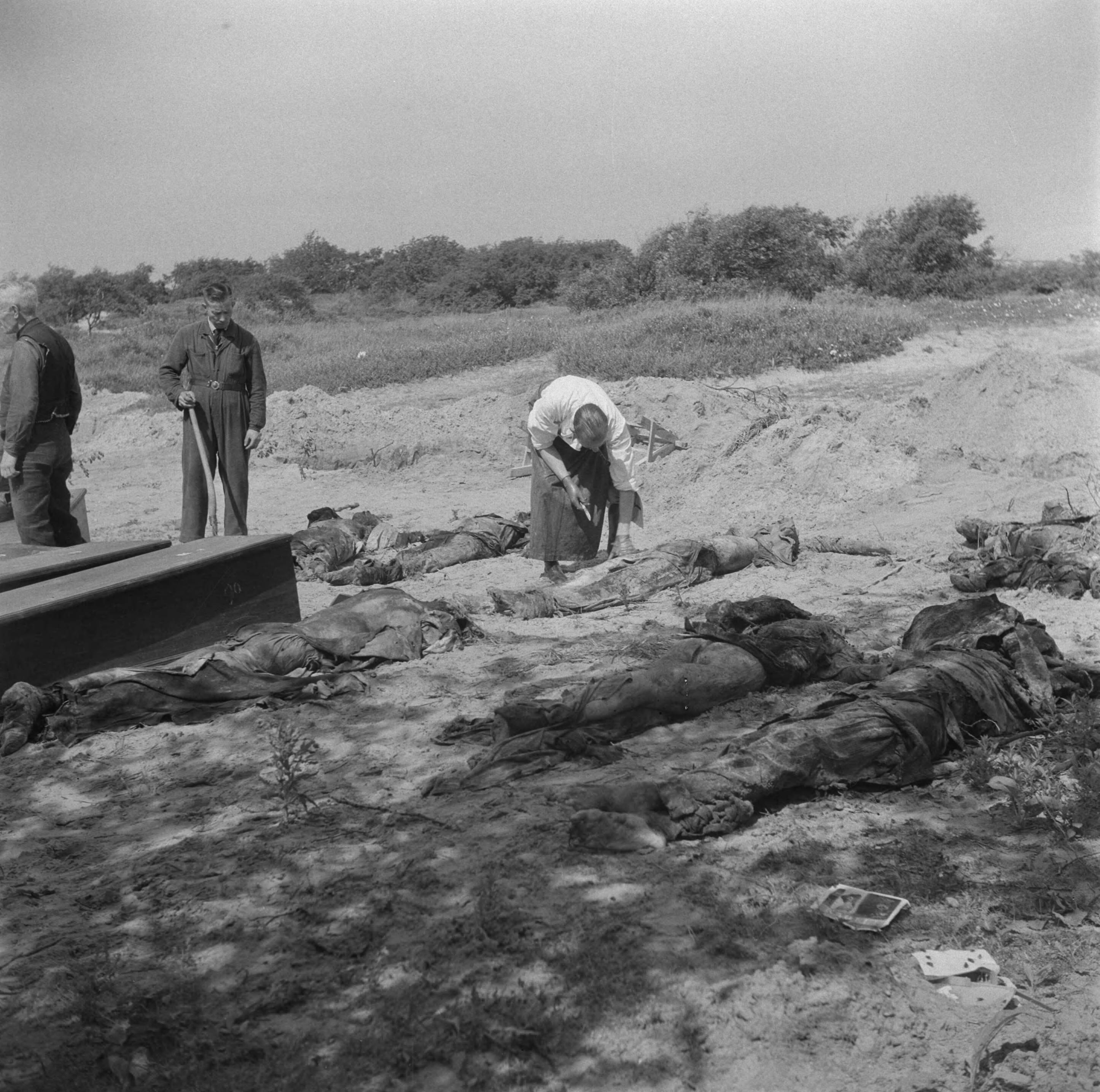 De Ondergrondse vond in duinen bij Overveen een massagraf van 104 gefusilleerde verzetslieden. De overheid stelt een onderzoek in. De patholoog-anatoom mej. Nilant aan het werk