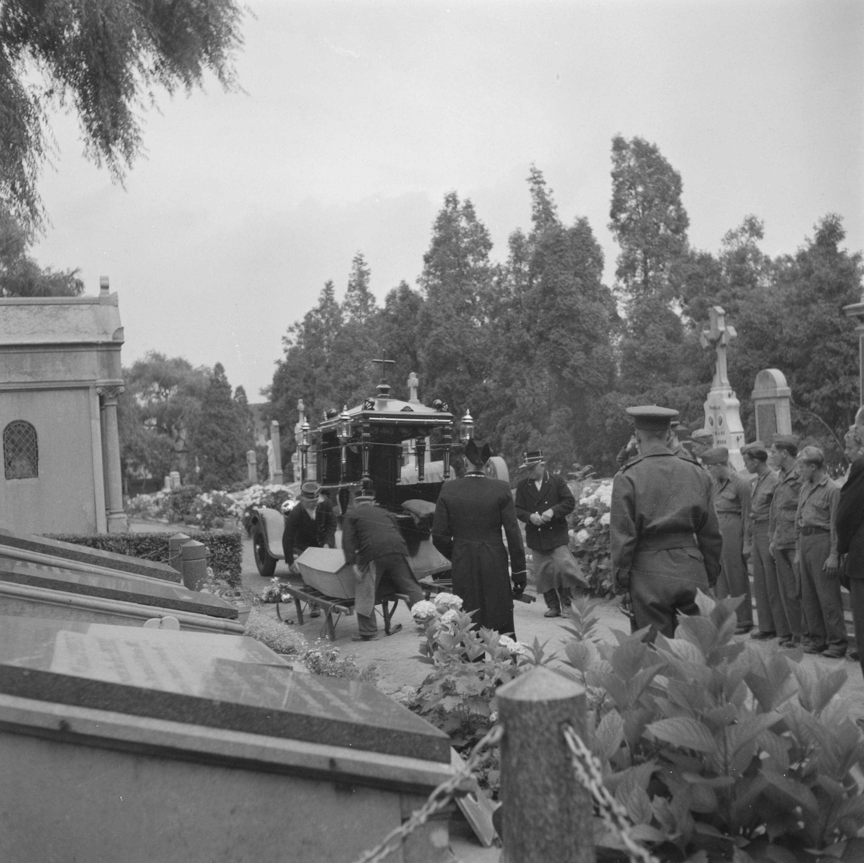 Uitvaart kist wordt uit lijkwagen op een baar geplaatst