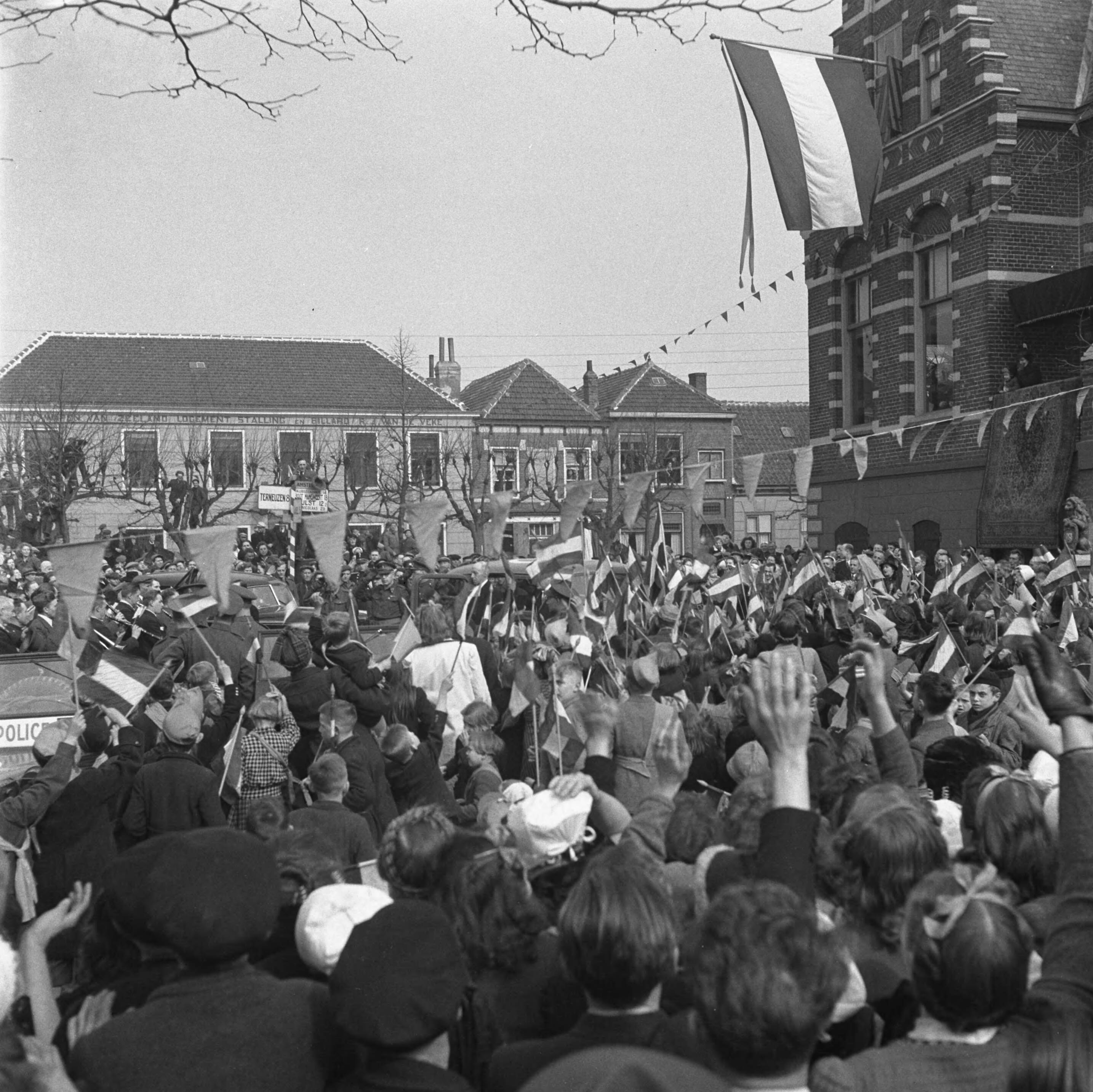 Koningin Wilhelmina arriveert bij het stadhuis van Zaamslag.