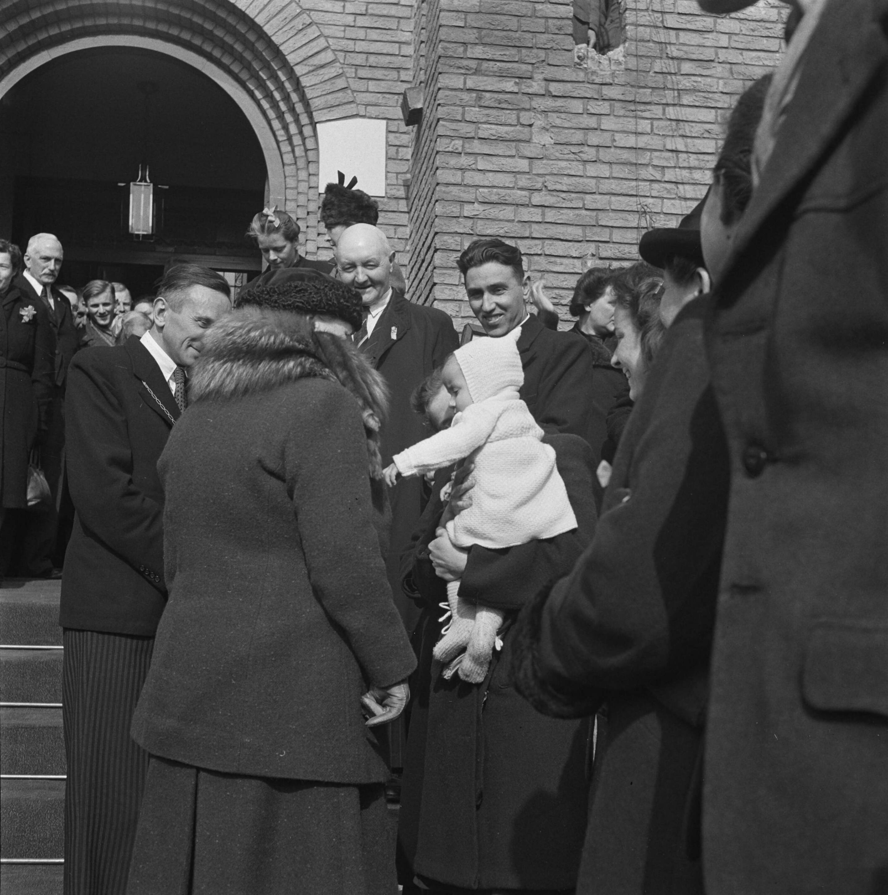 Axel. Voor het stadhuis wordt een baby aan koningin Wilhelmina getoond. Naast haar burgemeester P.L.D.J. van Oeveren