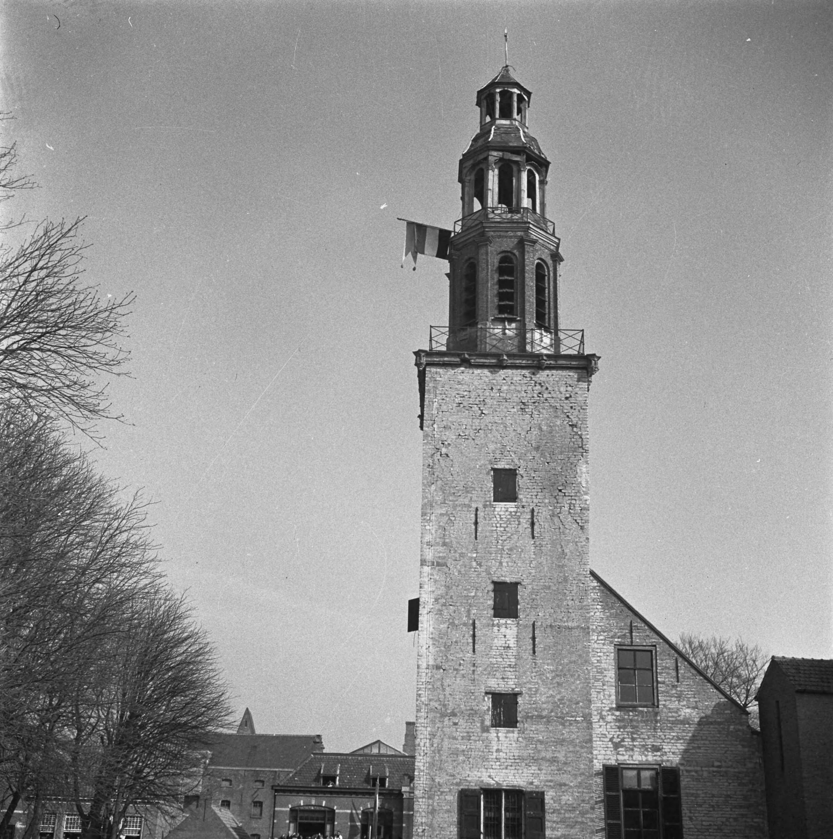 De Nederlandse vlag en een rode wimpel hangt aan de toren van het stadhuis van Hulst