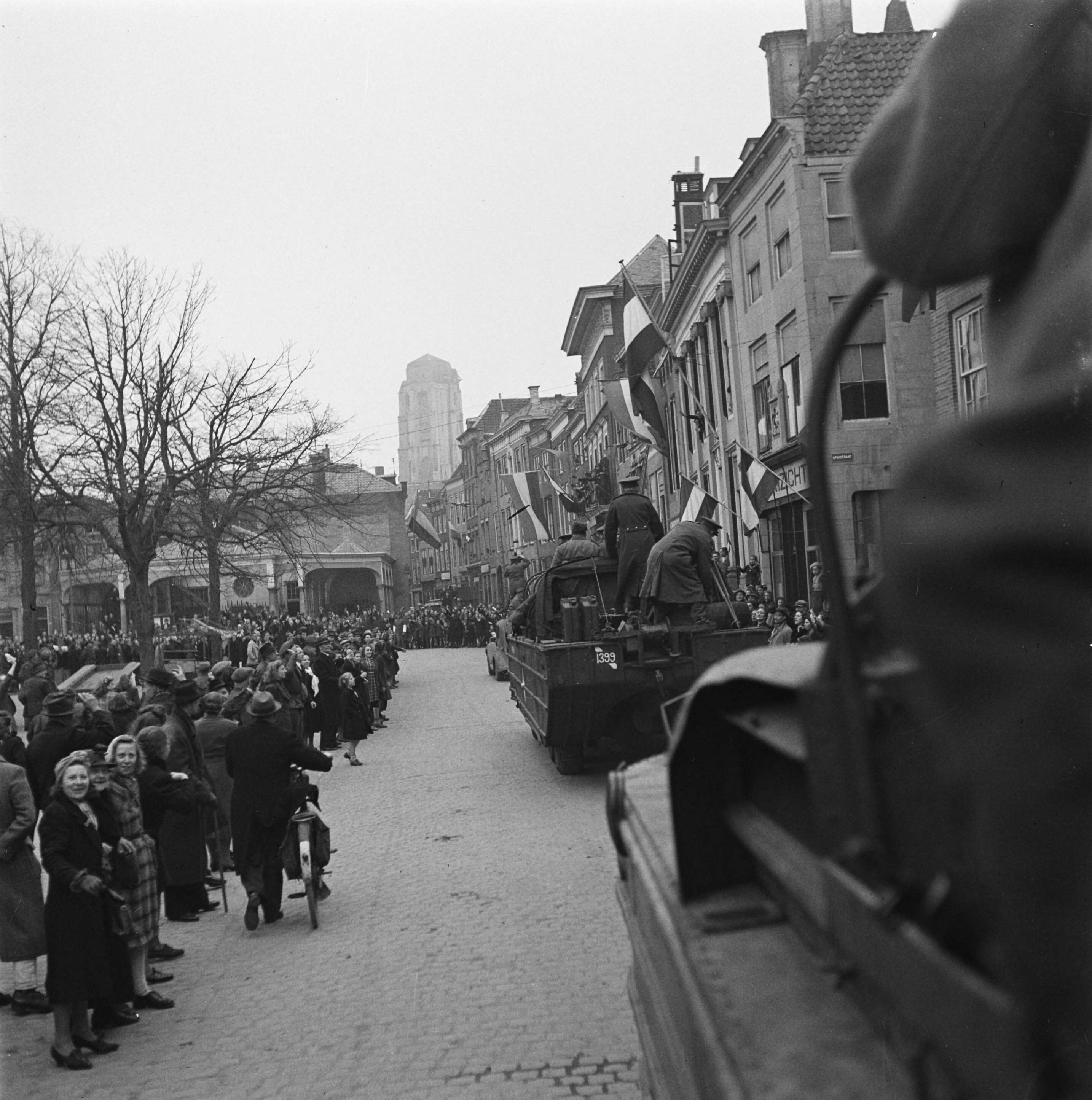 Colonne met DUKW amfibievoertuigen rijdt door de straten van Middelburg