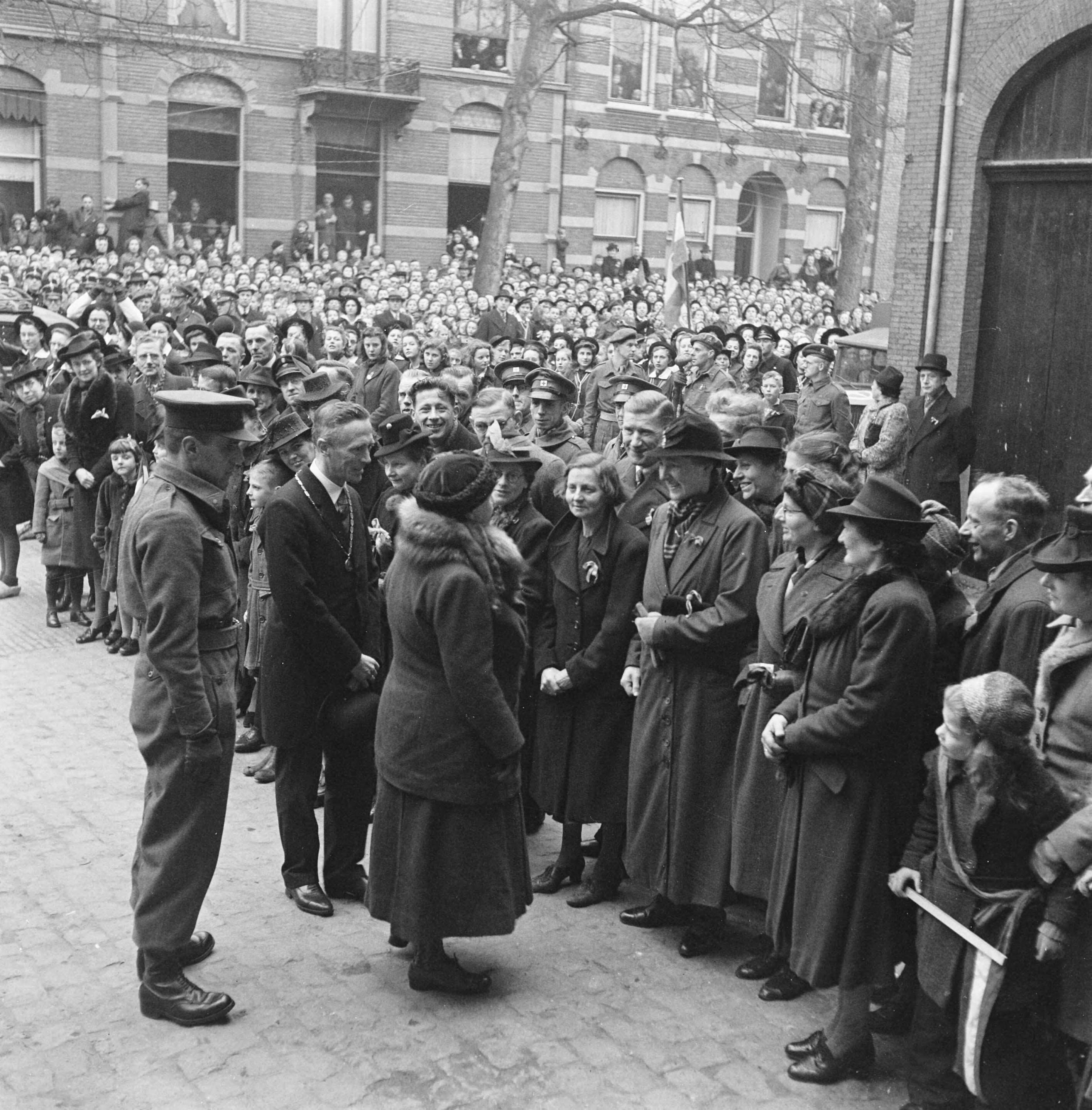 Middelburg? De vorstin onderhoudt zich met enkele vrouwen uit de bevolking. Weduwen? Naast haar een burgemeester