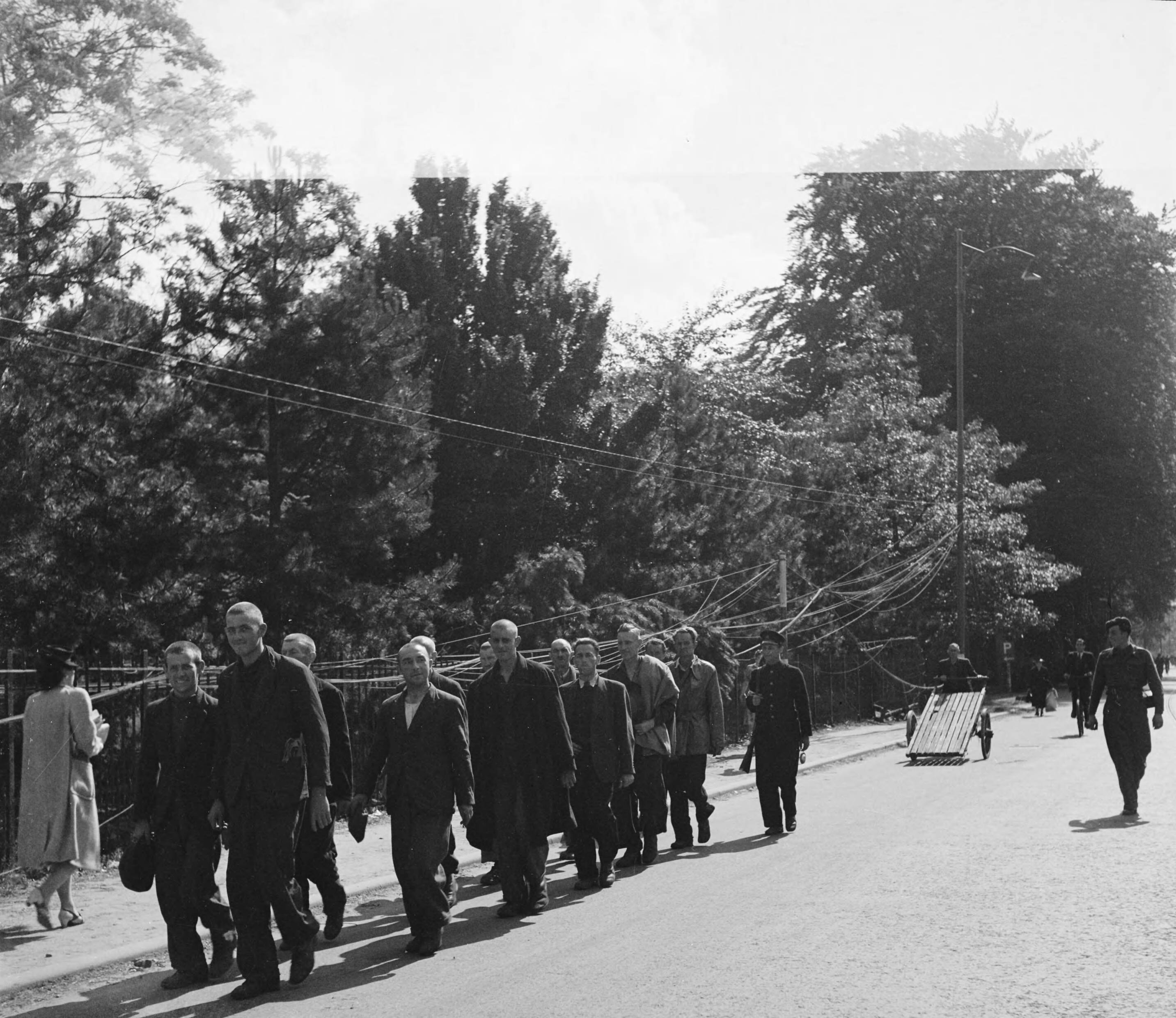 Een groep opgepakte collaborateurs wordt onder bewaking afgevoerd locatie Velperweg