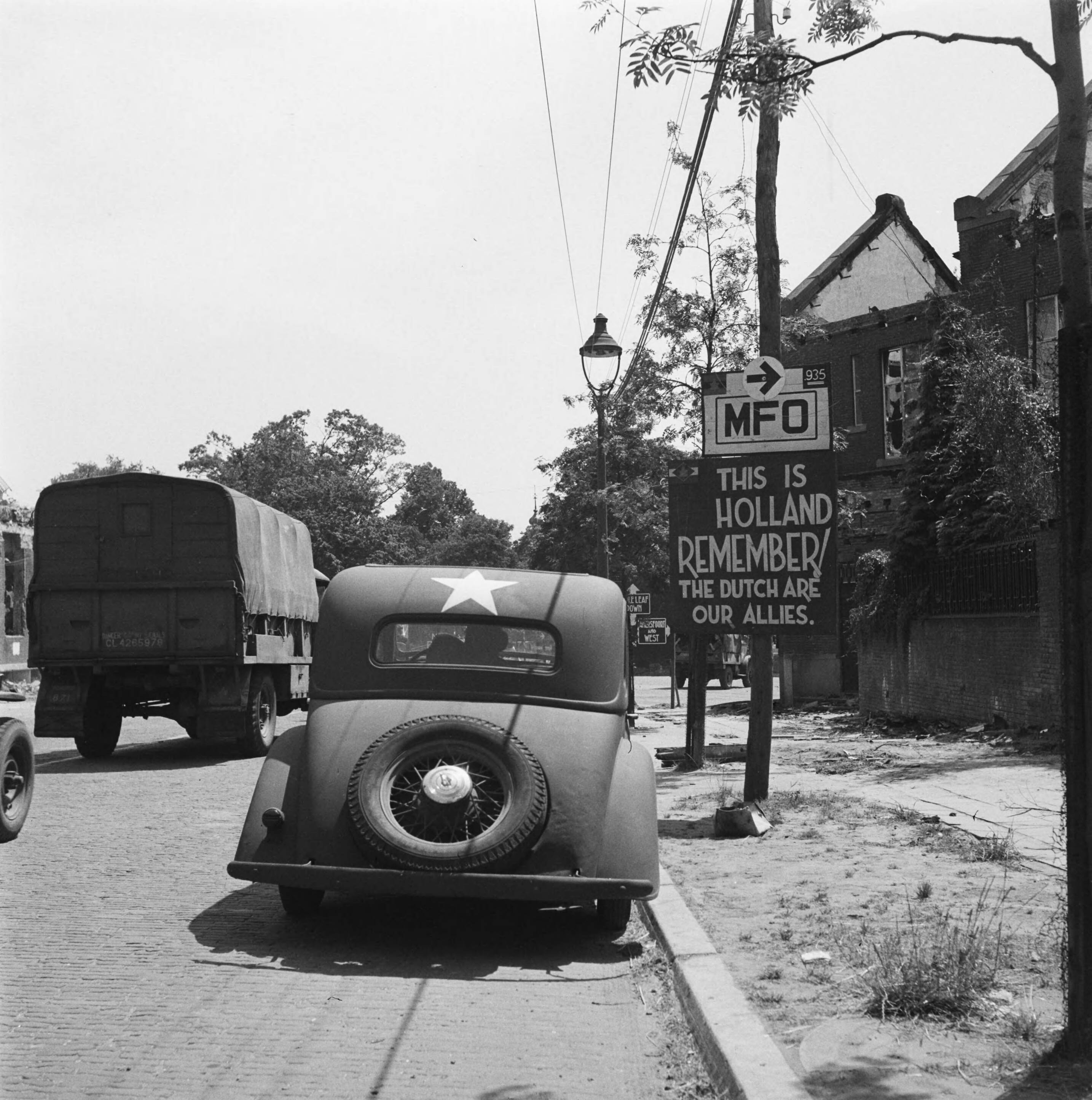 Bord met opschrift "This is Holland, REMEMBER, the Dutch are our allies".