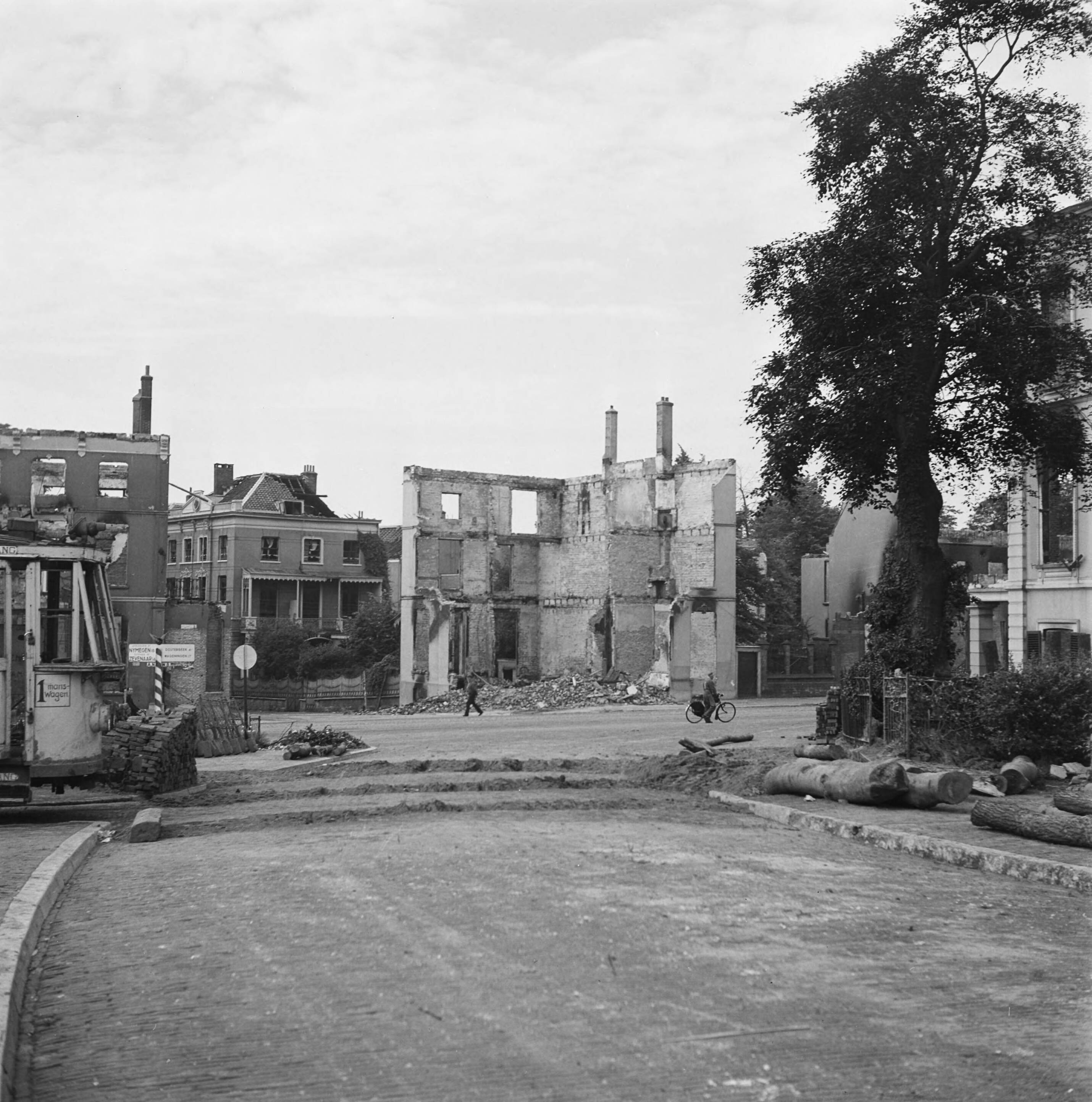Overzicht verwoestingen Stationsplein. Links een tram