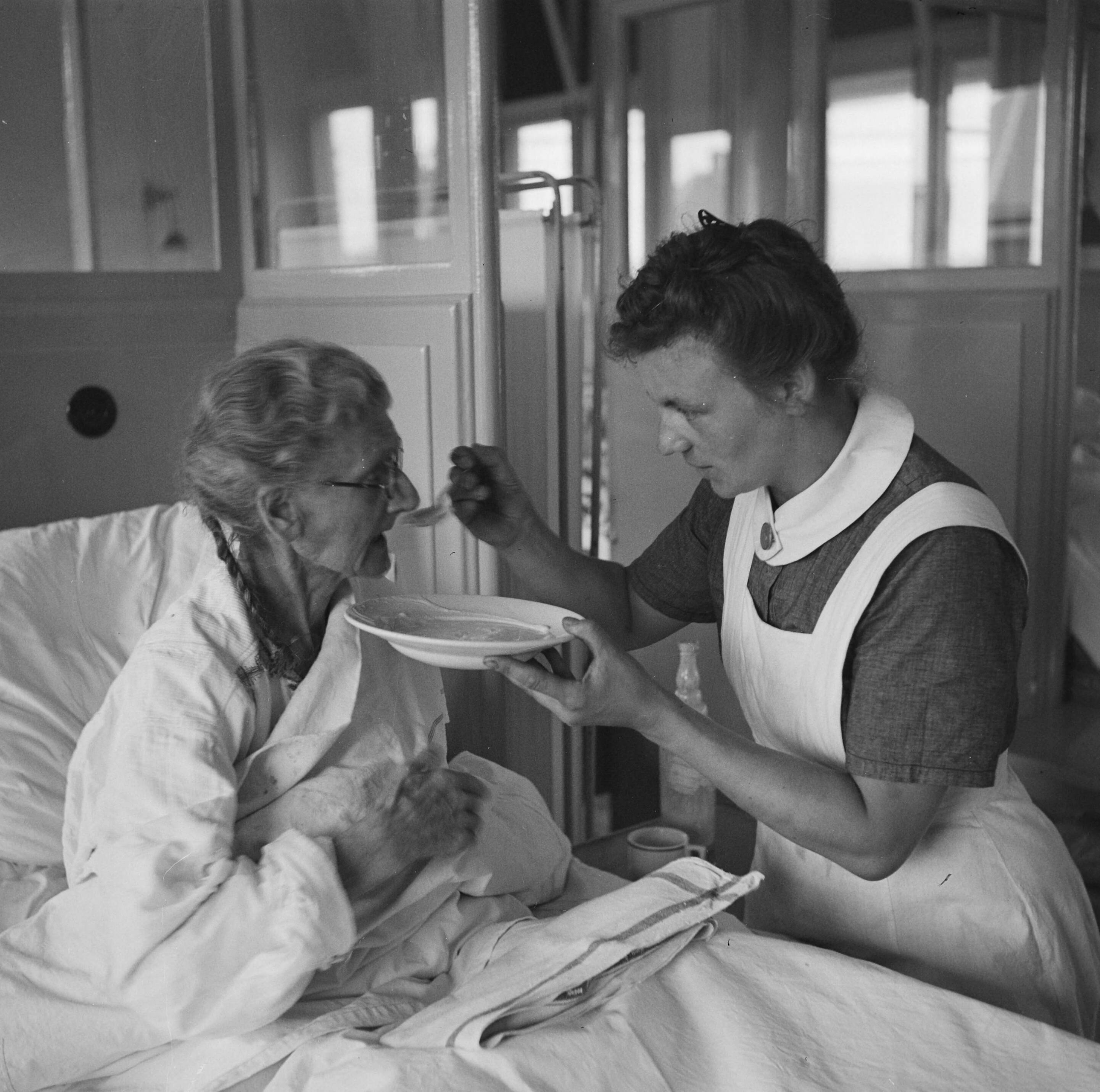 Een zuster geeft een bejaarde te eten