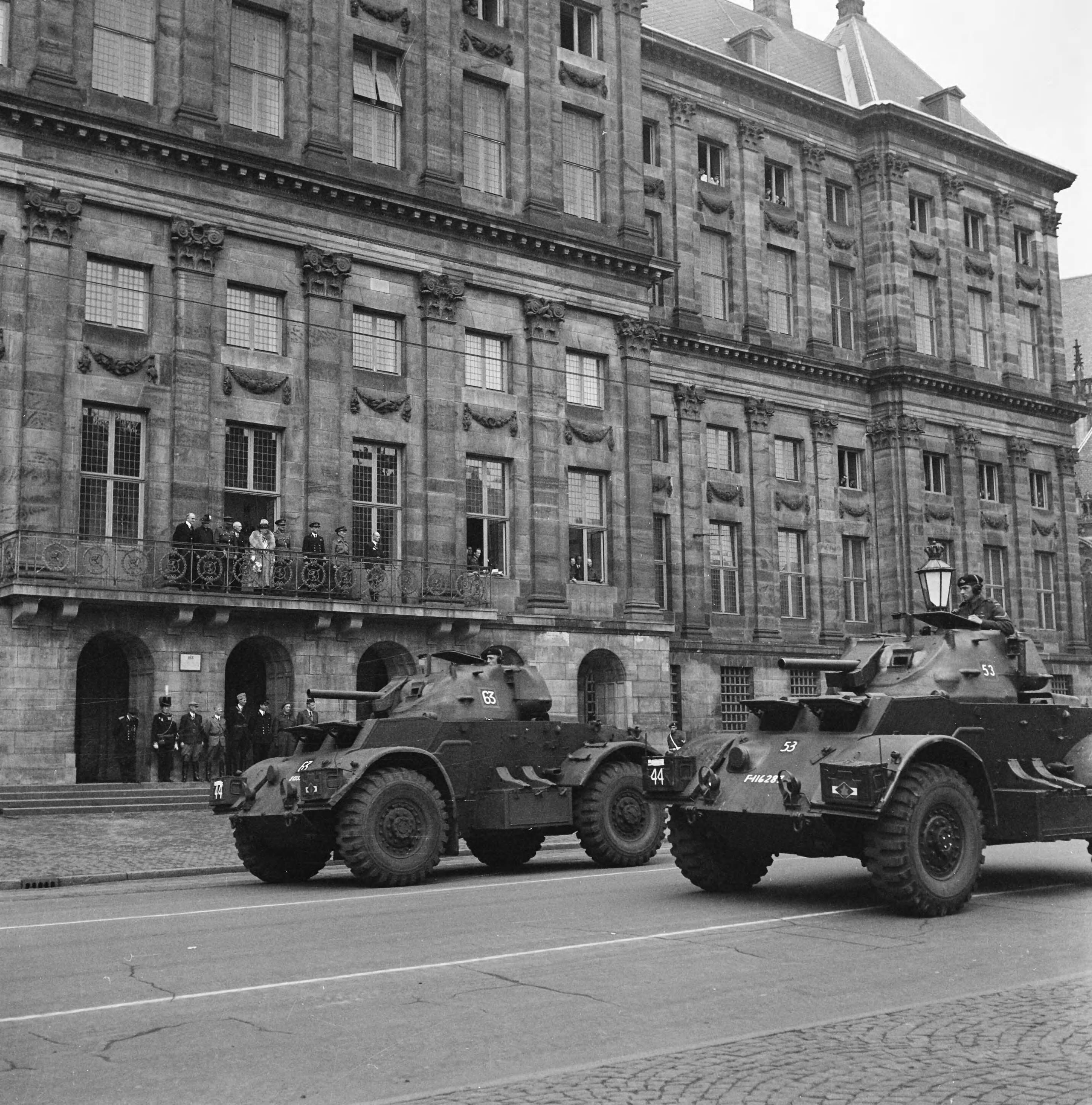 Defilé voor het Paleis op de Dam. Pantserwagens