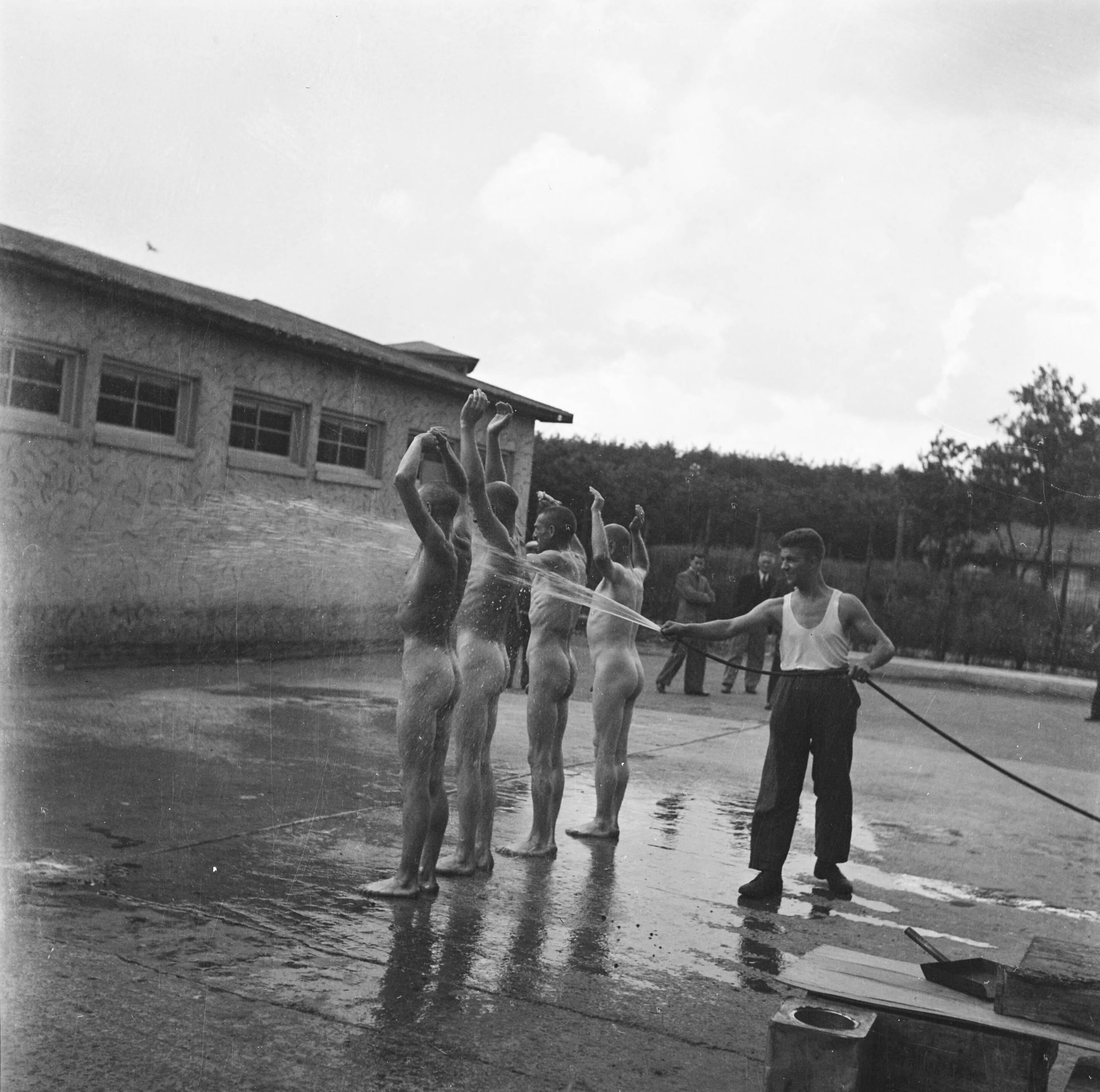 Vier naakte mannen worden worden met een tuinslang natgespoten